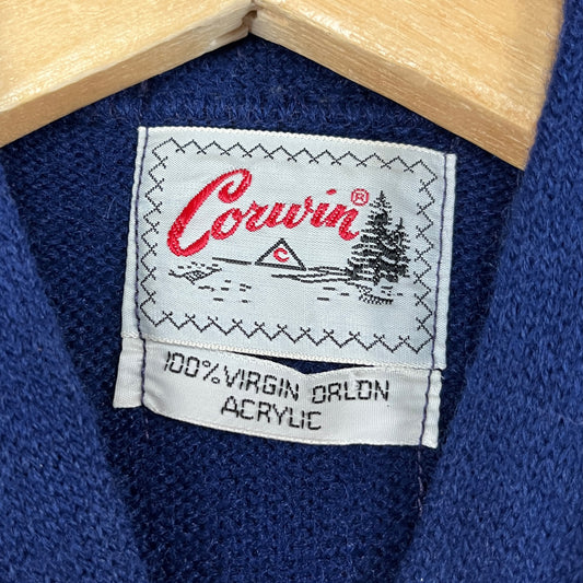 Vintage Toddler Boys Kids 70s Blue Red White Mountain Scene Stripe Corwin Knit Cardigan Sweater Top 12-18 Months