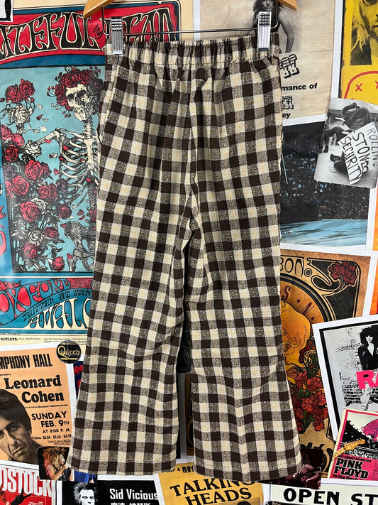 Vintage Kids Retro 60s-70s Brown Khaki Yellow Plaid Elastic Waist Buster Brown Flare Trouser Pants USA Size 6X-7 Slim