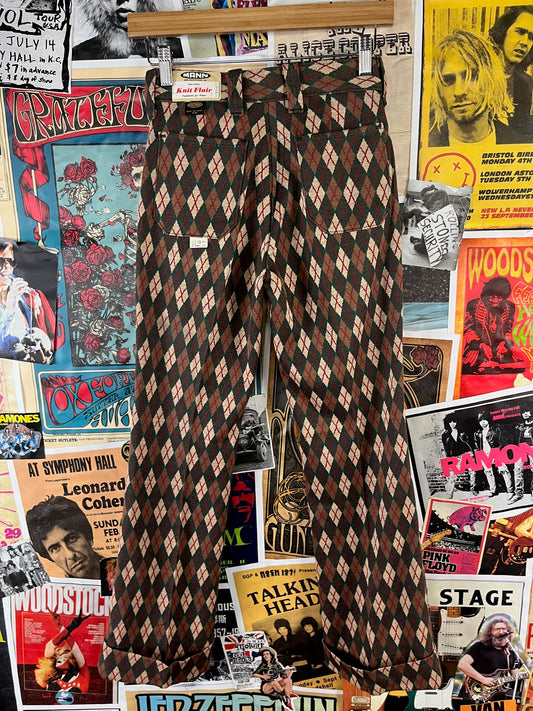 Vintage Boys 1960s-70s Green Argyle Diamond Print Knit Mann Flares Pants