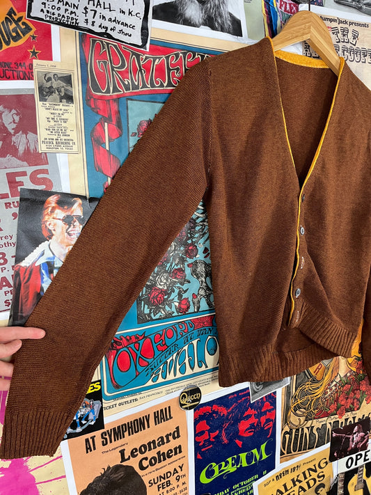 Vintage Kids Boys 50s-60s Brown Yellow Distressed Grunge V-Neck Cardigan Sweater Size 14 Ages 10-11