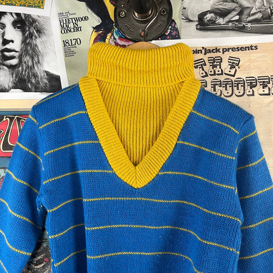 Vintage Boys 60s Blue Yellow Striped Knit Dickie Turtleneck Sweater Top 3T