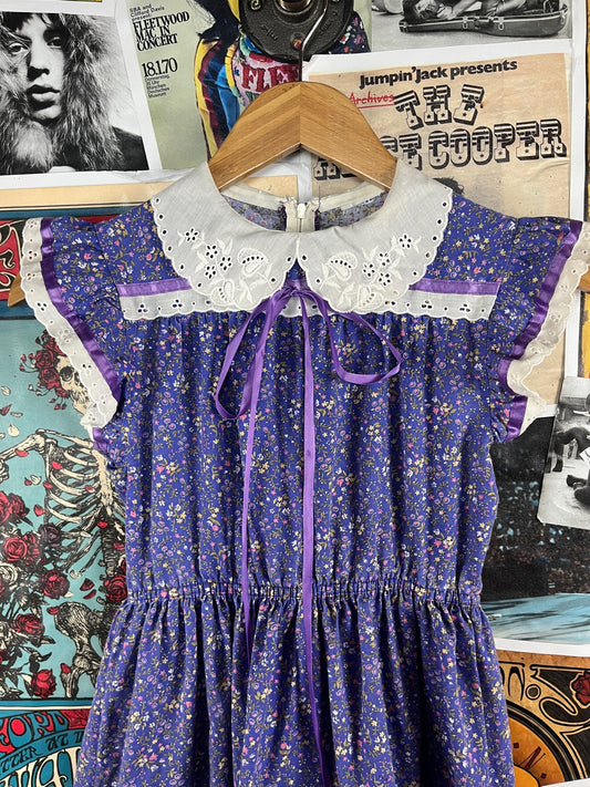 Vintage Girls Kids 70s-80s Purple Tiny Ditsy Floral Lace Trim Ribbon Cottagecore Prairie Dress Size 8 Age 6-7