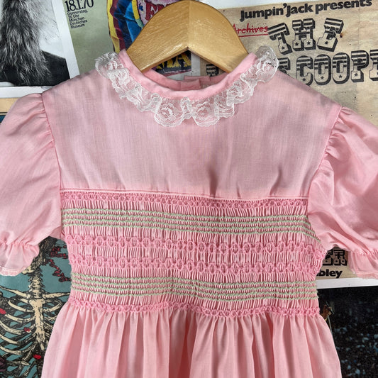 Vintage Toddler Girls Kids 70s Pink Smocked Lace Trim Collared Short Puff Sleeve Sears Dress Size 4T Age 3-4