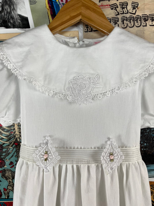 Vintage Girls Kids 90s White Lace Tulle Lined Pink Rosette Belted Sunday Best Dress Size 10 Age 8-9