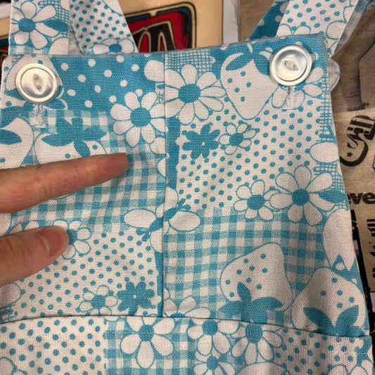 Vintage Toddler Girls 60s-70s Blue White Mushroom Floral Apple Gingham Patchwork Print Overall Romper 18-24 Months
