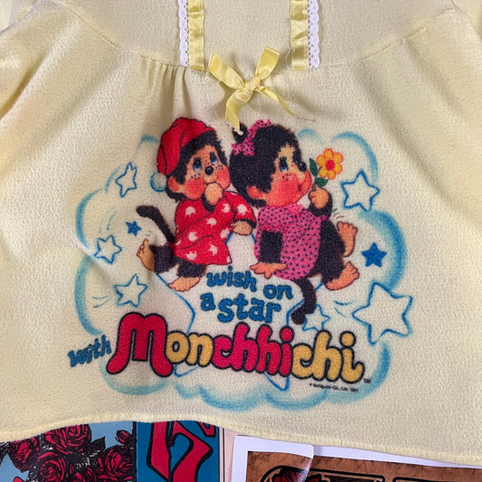 Vintage Toddler Girl Kids 80s Yellow Wish on a Star Monchhichi Japan Sekiguchi Cartoon Ruffle Lace Ribbon PJ Pajama Top 4T-5T