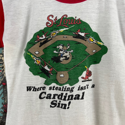 Vintage Kids 1980s MLB St. Louis Cardinals Funny Baseball Graphic Ringer T-Shirt Size 10 Age 8-9 Sportswear