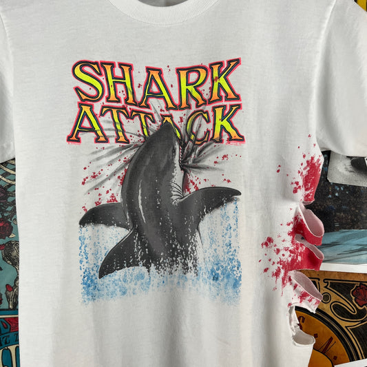 Vintage Kids 90s White Neon Shark Attach Miami Florida Oneita Graphic Souvenir T-Shirt Size 14/16 Age 10-12