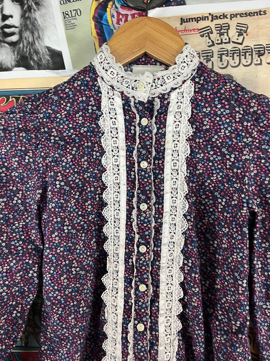 Vintage Girls Kids 70s Purple Tiny Floral Print Lace Collared Gunne Sax Prairie Blouse Shirt Size 10 Age 8-9