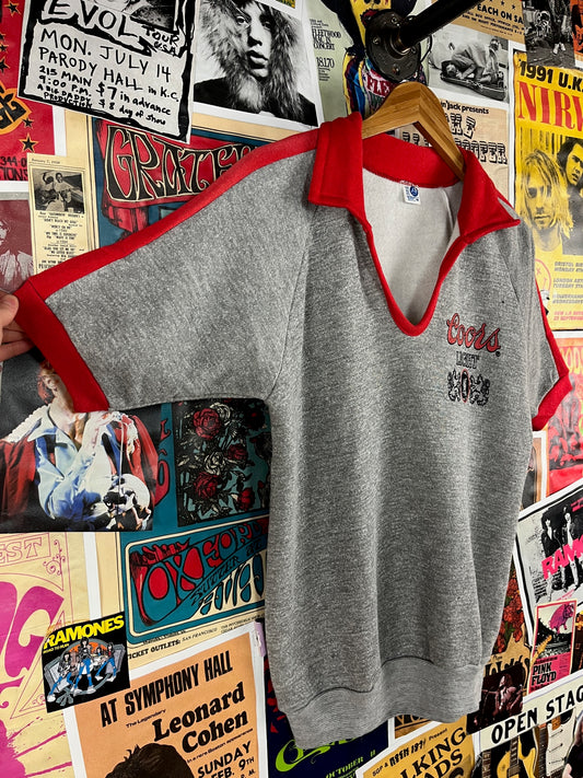 Vintage 70s-80s Gray Red Short Sleeve Coors Light Beer Rayon Blend Raglan Pullover Collared V-Neck Sweatshirt