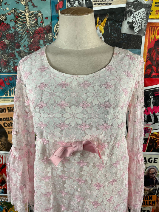 Vintage Women's 60s White Pink Floral Lace Ribbon Bell Sleeve Babydoll Mini Dress XS Retro