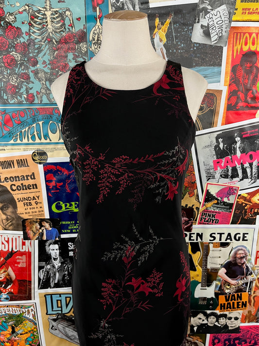 Vintage Women's 90s Black Red Gold Metallic Sparkle Botanical Floral Print Sleeveless All That Jazz Spandex Bodycon Maxi Party Dress XS