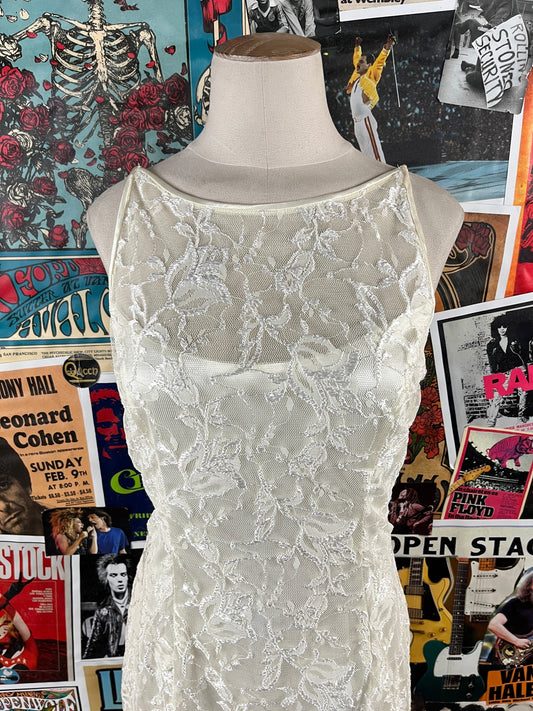 Vintage Womens 90s Ivory White Floral Lace Beaded Strap Sleeveless Backless Boatneck Scott McClintock Wedding Evening Prom Dress XS
