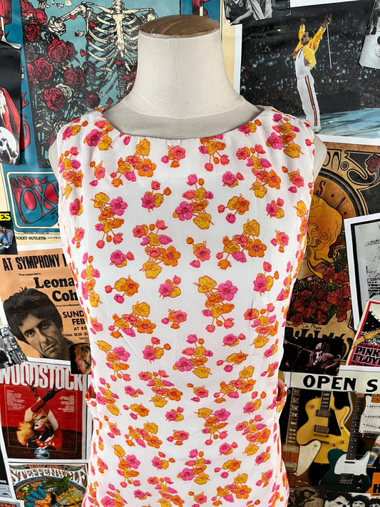 Vintage Women's 60s White Pink Floral Print Sleeveless Belted Sheath Mini Dress XS