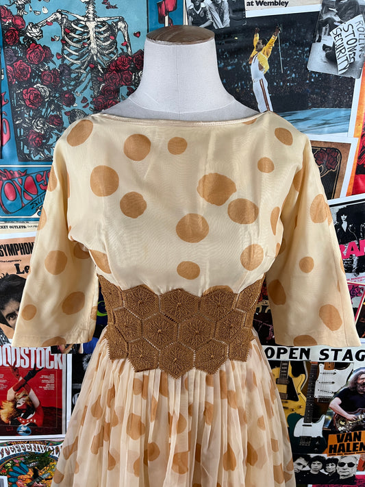Vintage Women's 1950s Nude Polka Dot Print Lace Fit and Flare Cocktail Tea Gown Dress XS