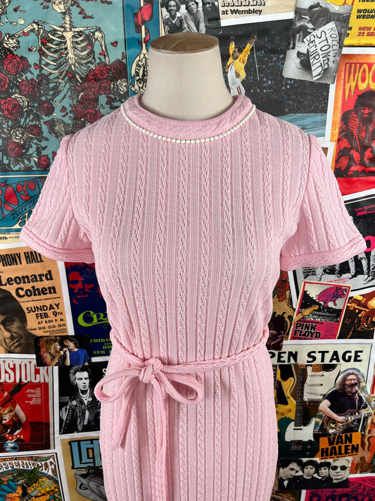 Vintage Women's 60s Pink Knit Leslie Fay Retro Glam Belted Short Sleeve Pearl Beaded Dress XS/S