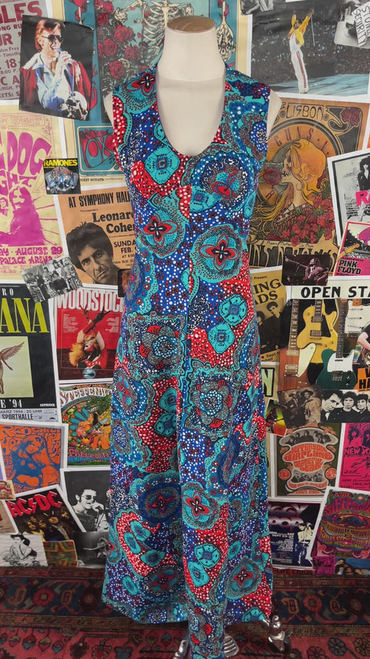 Vintage Women's 60s Blue Multi-Color Floral Polka Dot Print Sleeveless Scoop Maxi Disco Dress XS