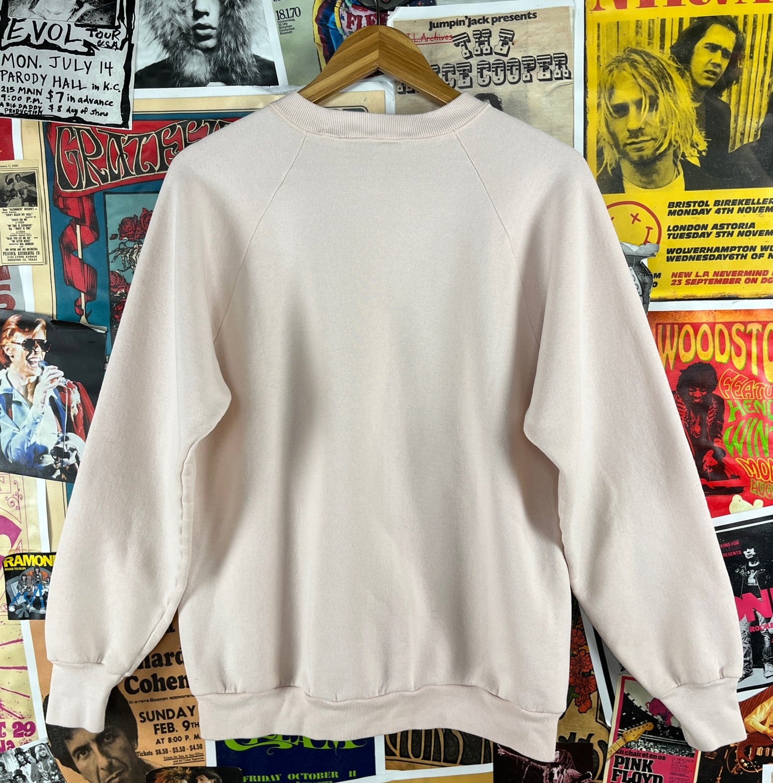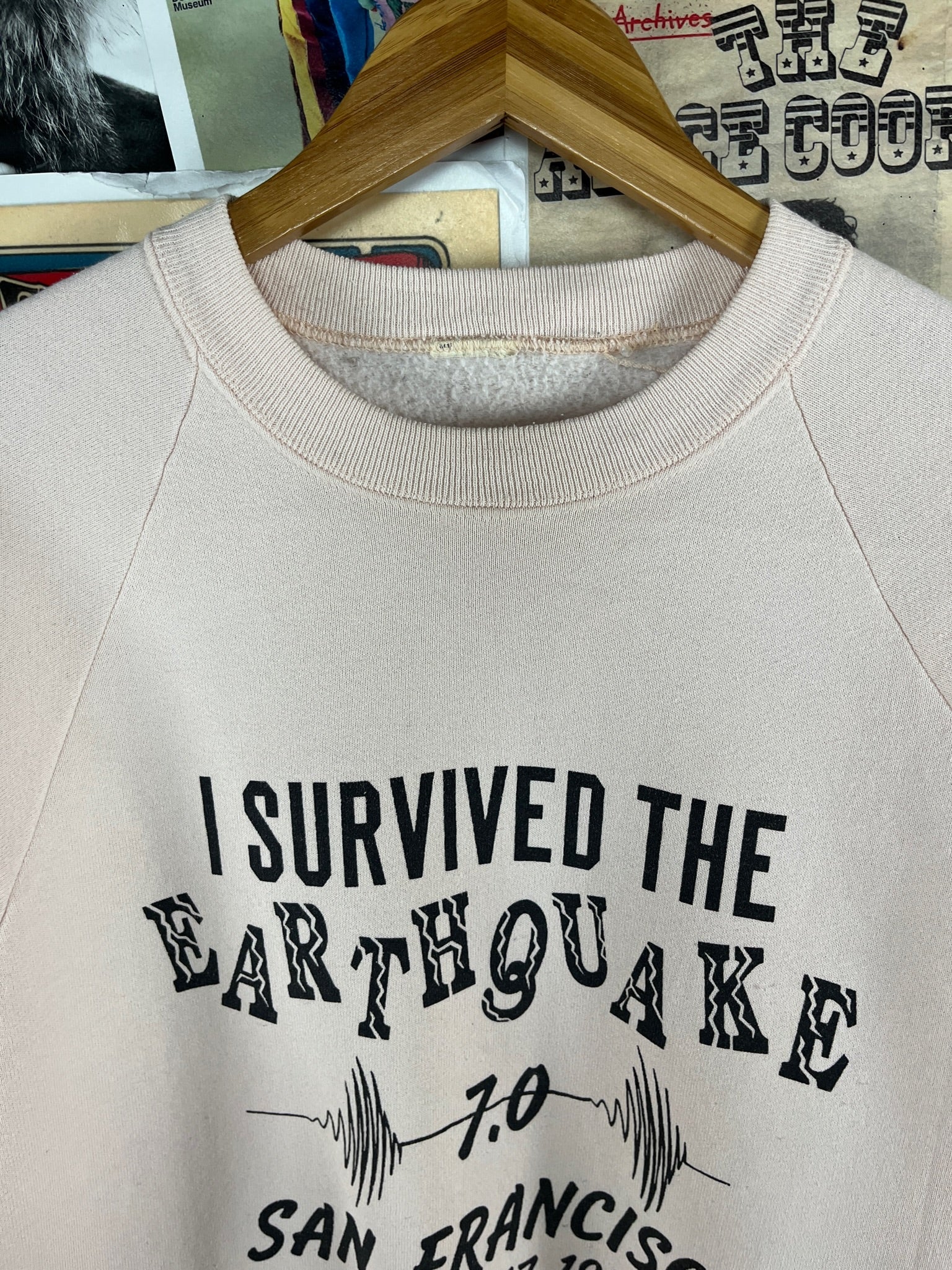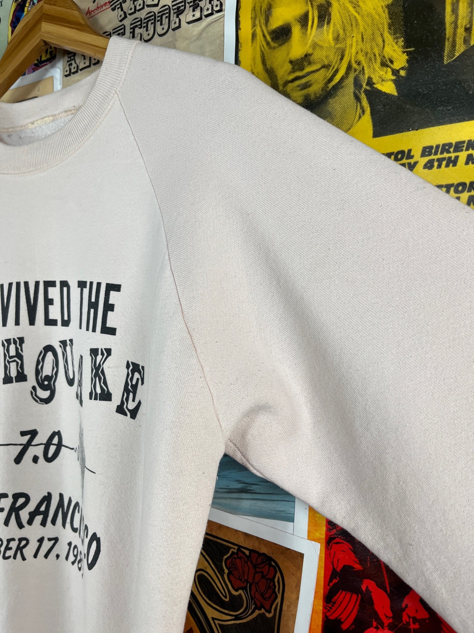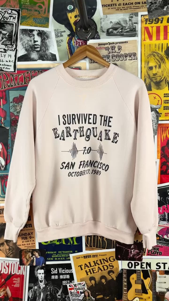 Vintage 1980s light pink long sleeve I Survived the Earthquake 7.0 San Francisco October 17, 1989 graphic souvenir crewneck pullover sweatshirt. Has light piling through, a stain on the front left, as well as a faint spot on the sleeve (see images). There is no label or tag intact. We estimate it to fit an adult M/L. Please check measurements as this is an estimate.