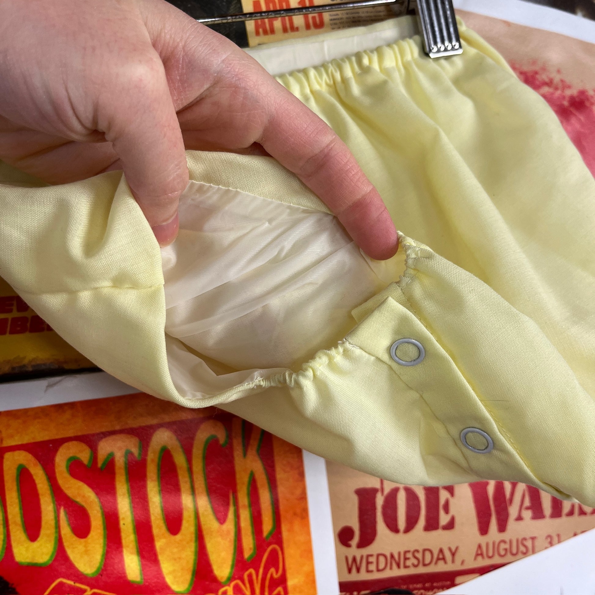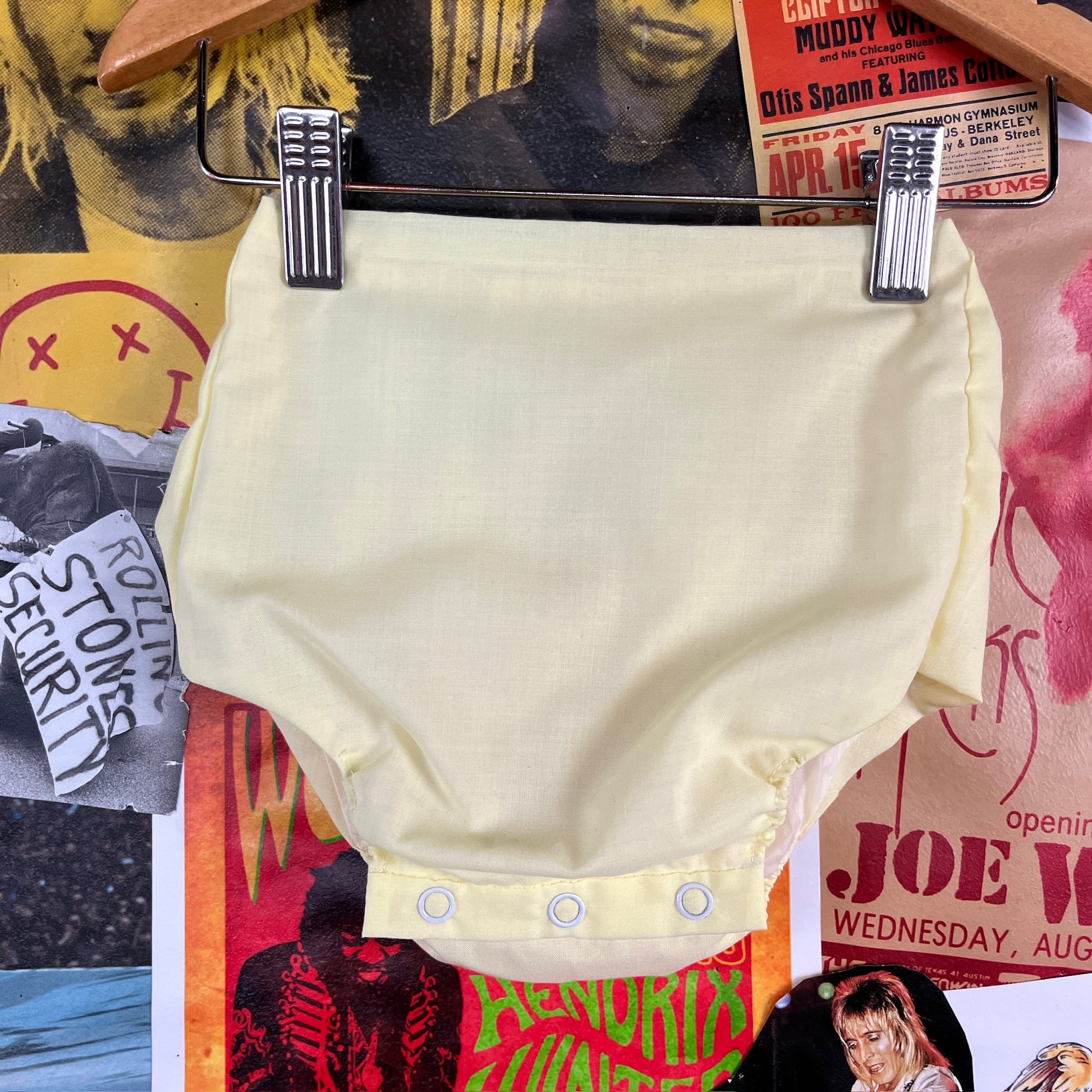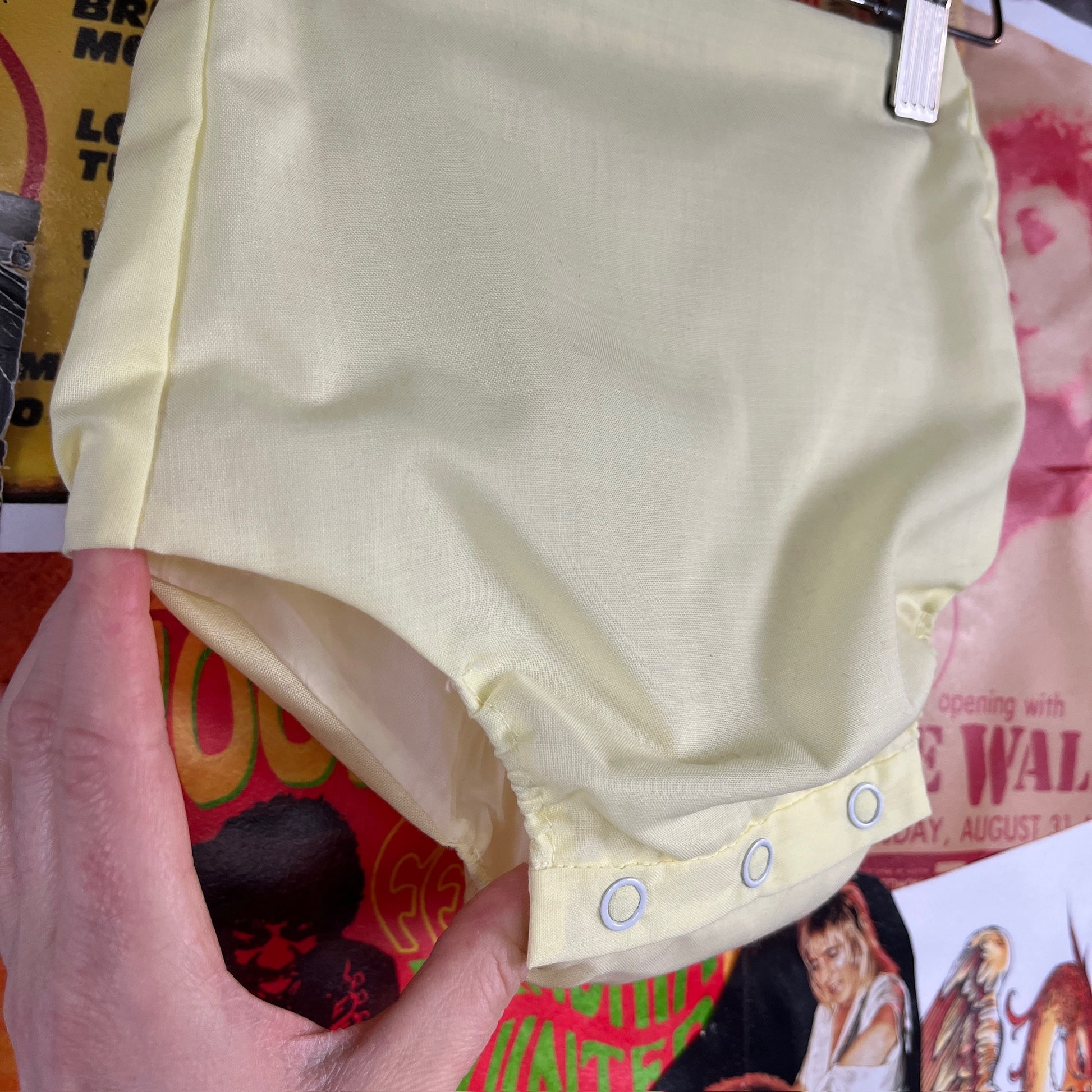 Vintage unisex baby 1950s-60s pastel yellow short sleeve collared button up top and matching elastic waist bloomers playsuit set. Features pleats and embroidered ducks with umbrellas. Bloomers snap at the seat. There are no tags intact - we estimate it to fit size 6-9 months. Please check measurements. Perfect for Spring or Easter!