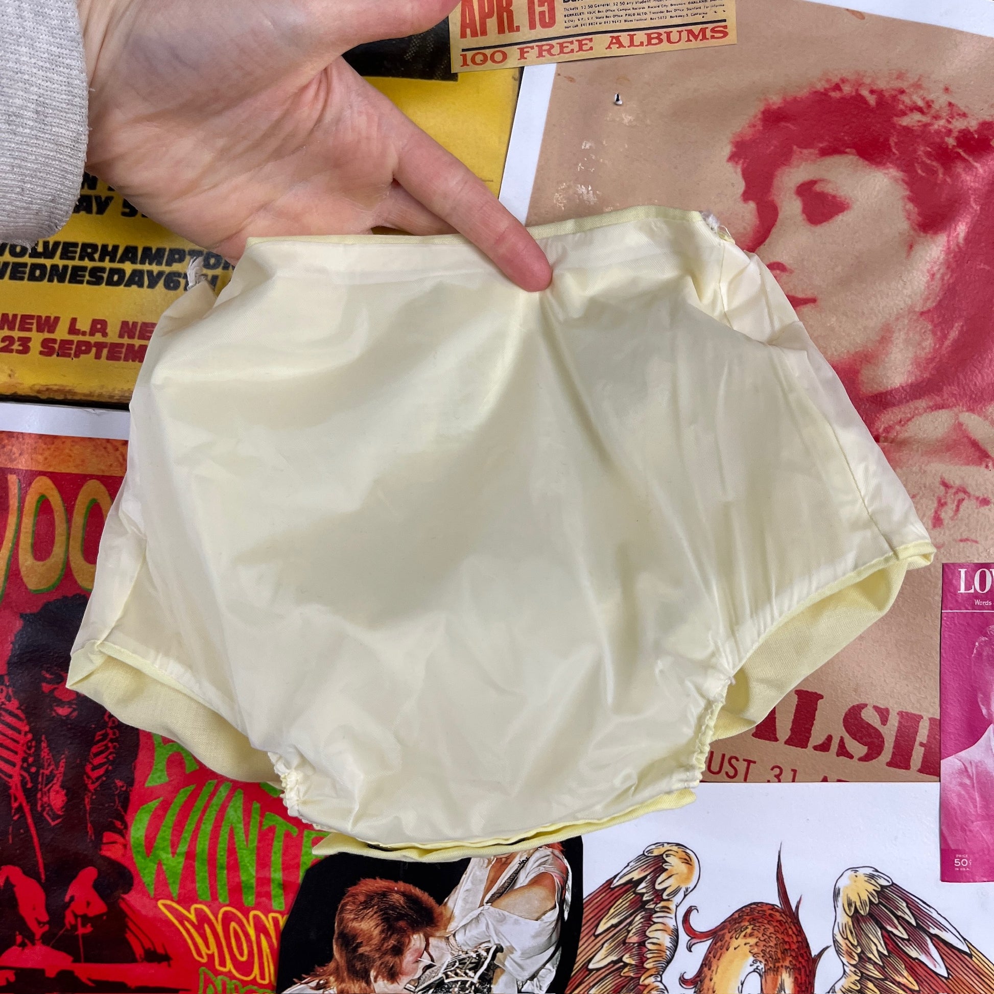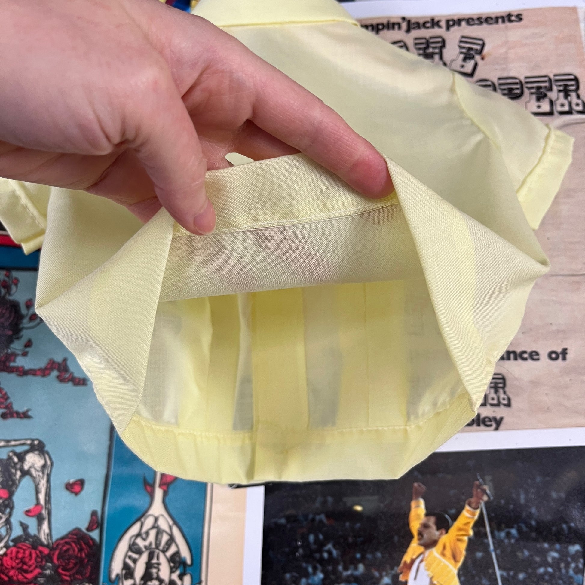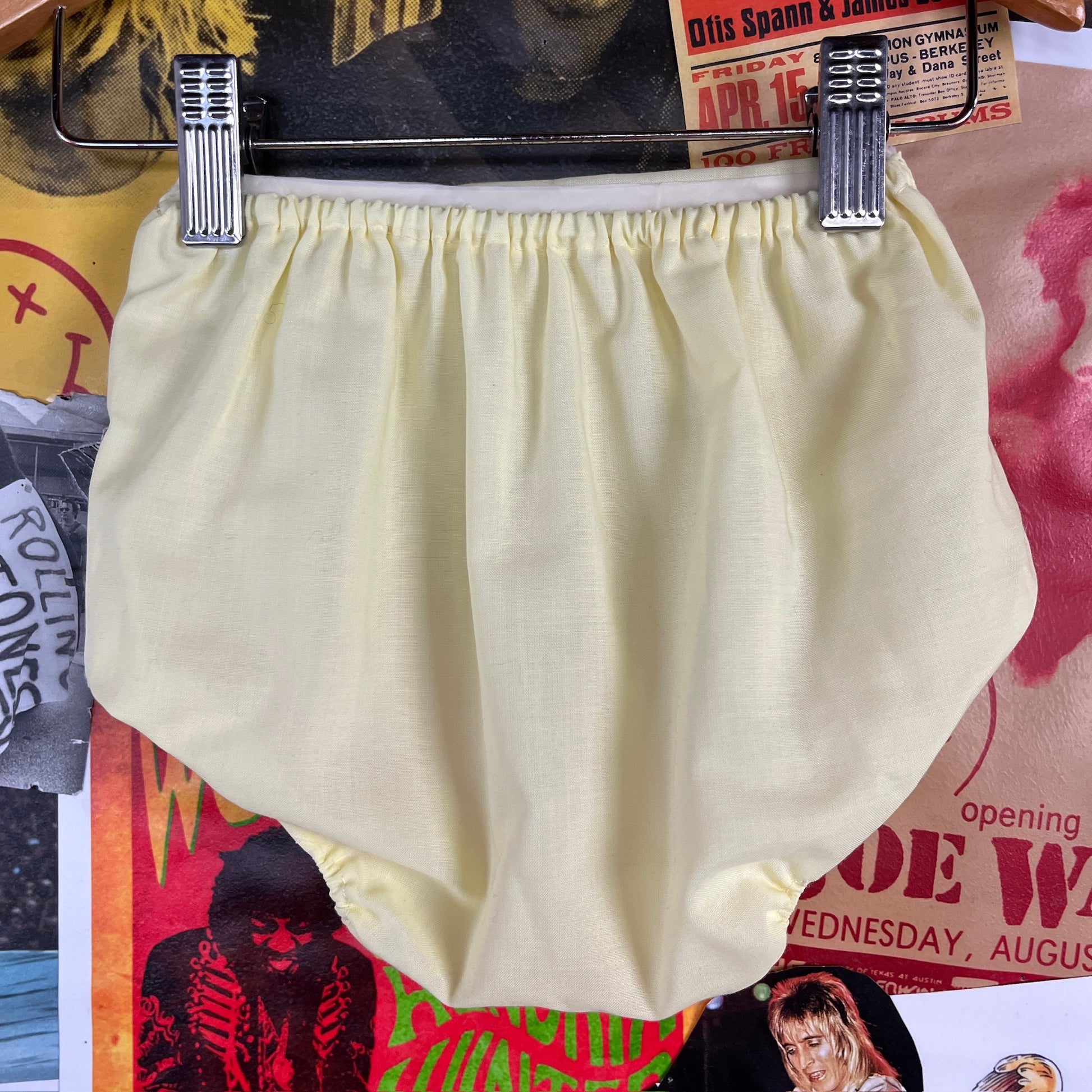 Vintage unisex baby 1950s-60s pastel yellow short sleeve collared button up top and matching elastic waist bloomers playsuit set. Features pleats and embroidered ducks with umbrellas. Bloomers snap at the seat. There are no tags intact - we estimate it to fit size 6-9 months. Please check measurements. Perfect for Spring or Easter!