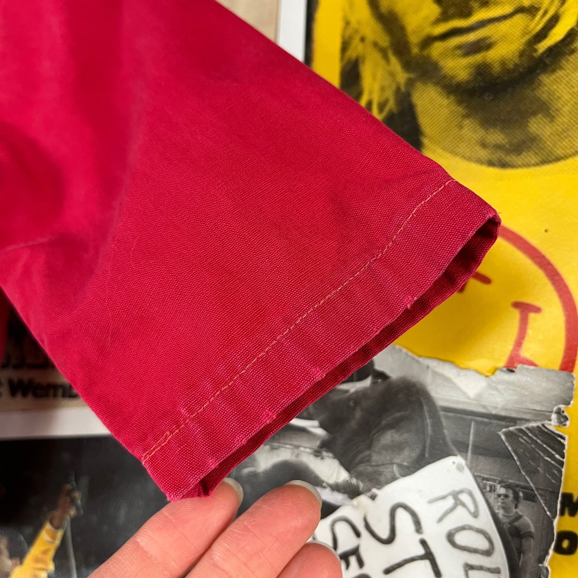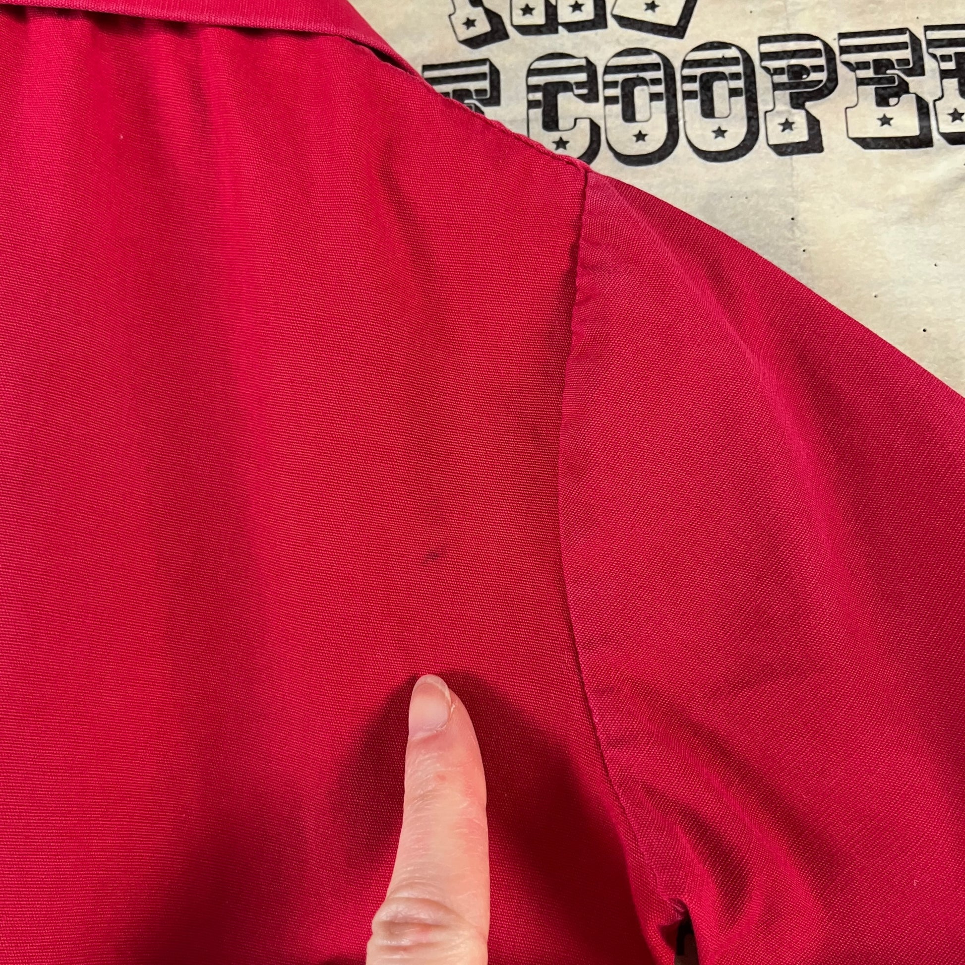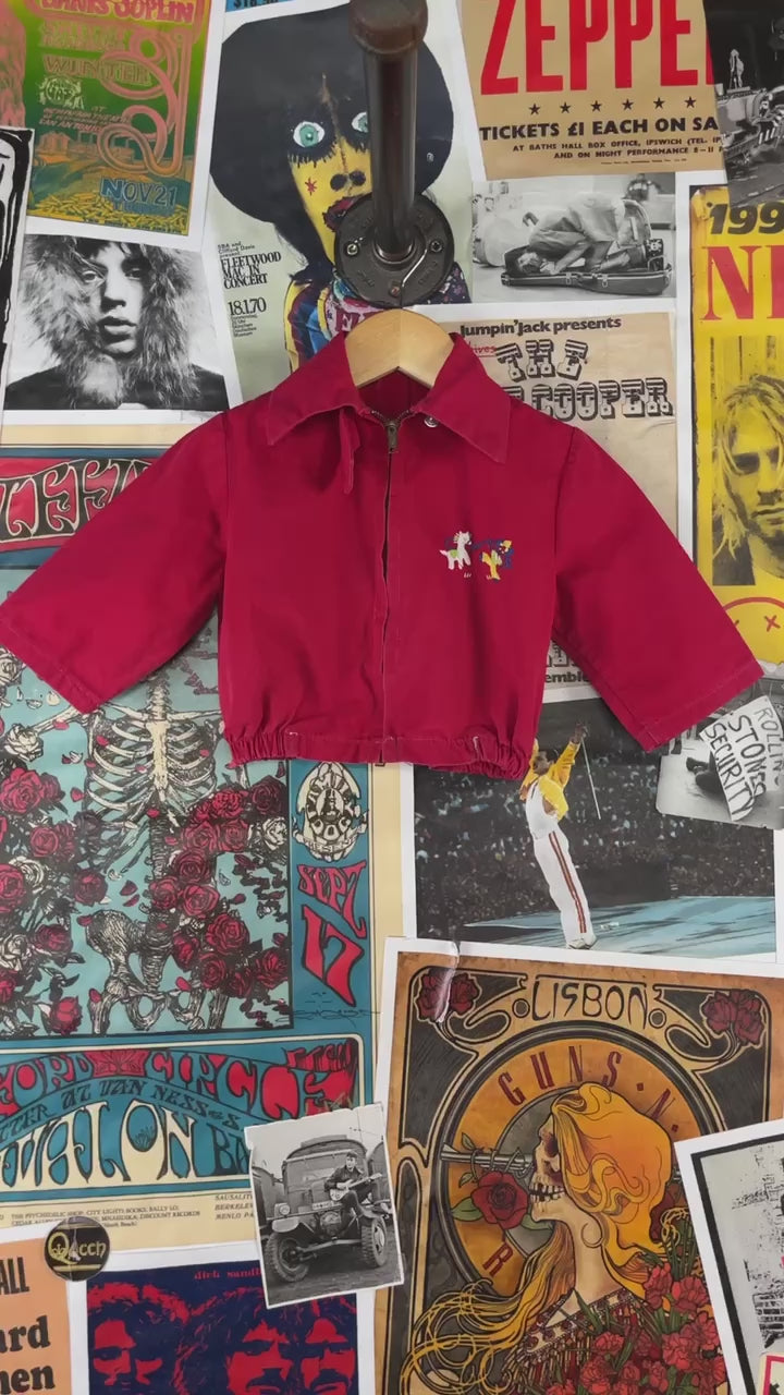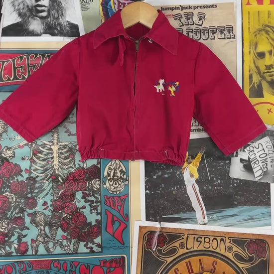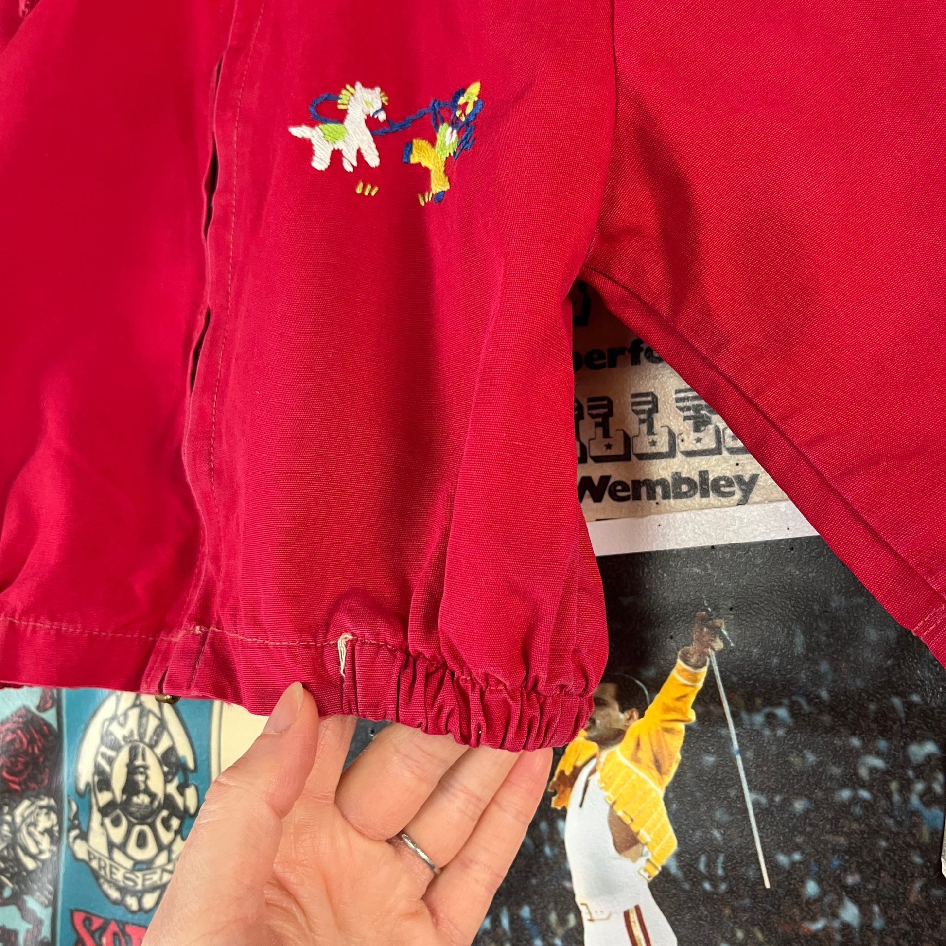 Adorable vintage baby kids 50s red long sleeve collared jacket with embroidered cowboy lassoing a horse. Zips up the front, buttons at the collar, and has elastic sides. Has a couple stains, little fabric nicks along the sleeve cuffs, and the seam is a bit undone on one sleeve. There is no label or tag size. We estimate it to fit size 9-12 months, but please check measurements as this is an estimate.