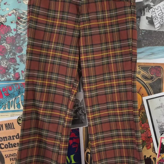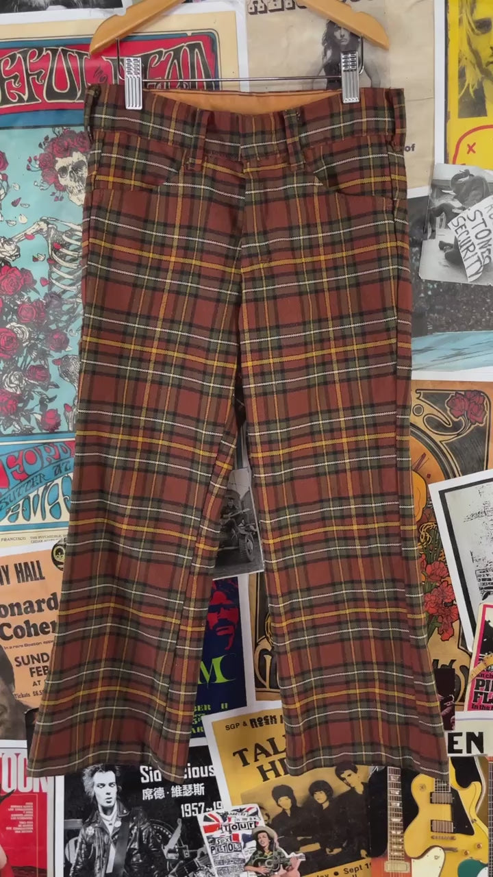 Vintage kids boys 70s retro brown, yellow, and white plaid print wide straight leg trouser pants by Sears, Roebuck and Co. Features hand pockets. Tagged size 8 husky. We estimate it to fit boys size 7 husky, ages 6-7. Please check measurements for accurate sizing. Feels like polyester, but am uncertain of the fabric content. Has piling through out and light wear on the seat.
