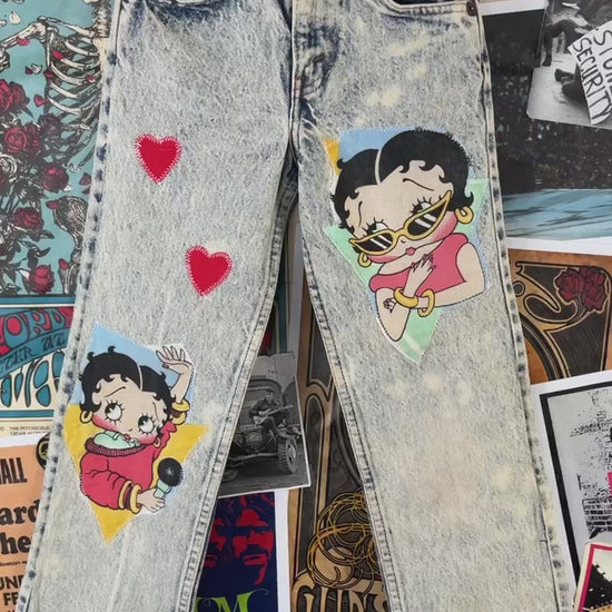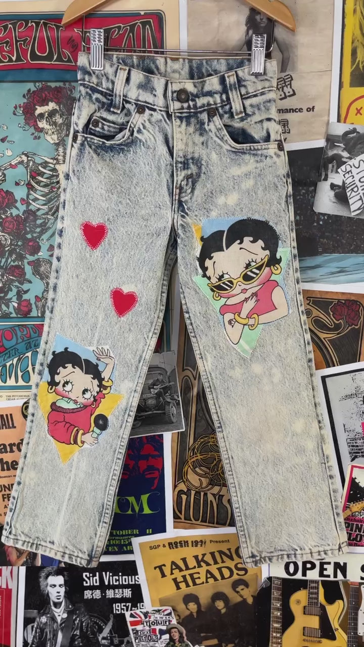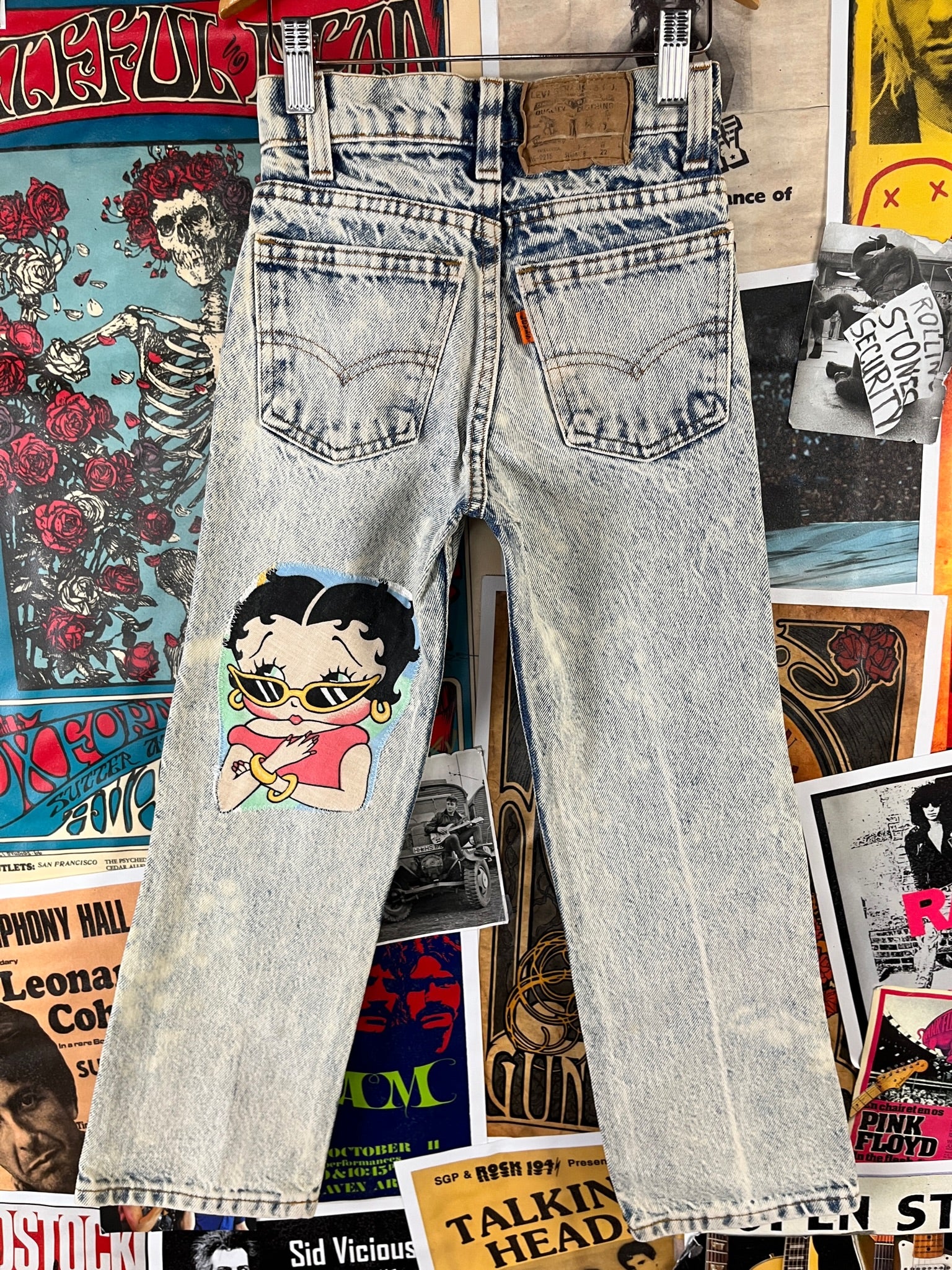 Rad vintage kids girls 1980s acid wash big E orange tab Levi's straight leg custom denim jeans with Betty Boop and hearts patches by So Cute. Made in Los Angeles USA. Are tagged a kids size slim 8. We estimate them to fit girls size 6X-7 slim, but please check measurements. Have light staining through out. Such a unique piece! Features a zip fly.