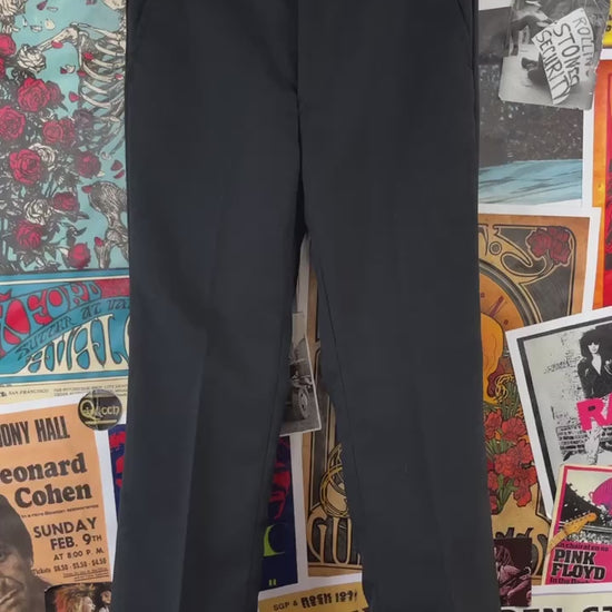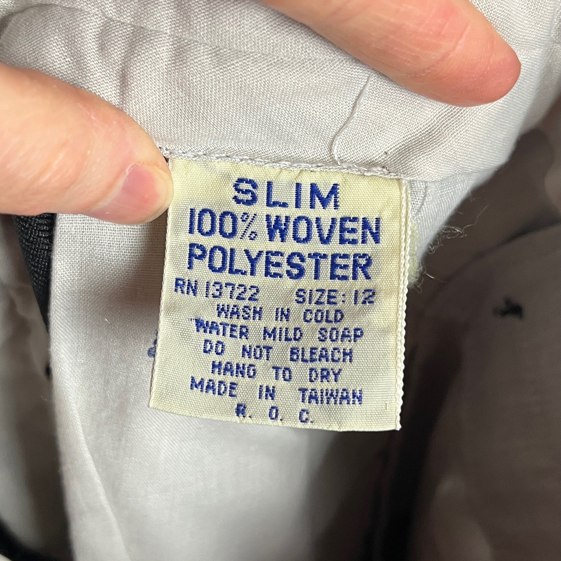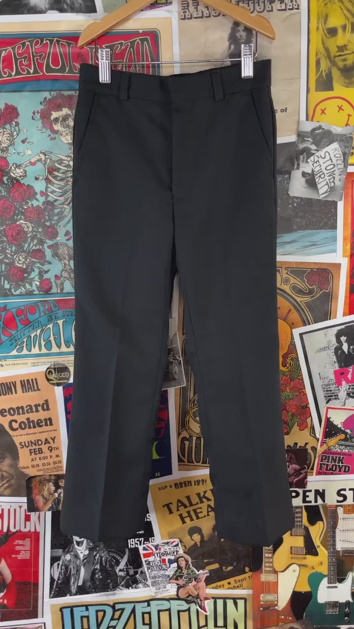 Vintage kids boys retro 1970s-80s solid plain black 100% woven polyester trouser pants. Made in Taiwan ROC. Features hand pockets, a zip fly, and fasten as the waist. Are in great preowned condition. Tagged size 12 slim. We estimate them to fit boys size 10-12 slim short, ages 8-9. Please check measurements as this is an estimate. Have a short fit, so please check inseam measurements - has an additional 1.75" of hem that could be let down.