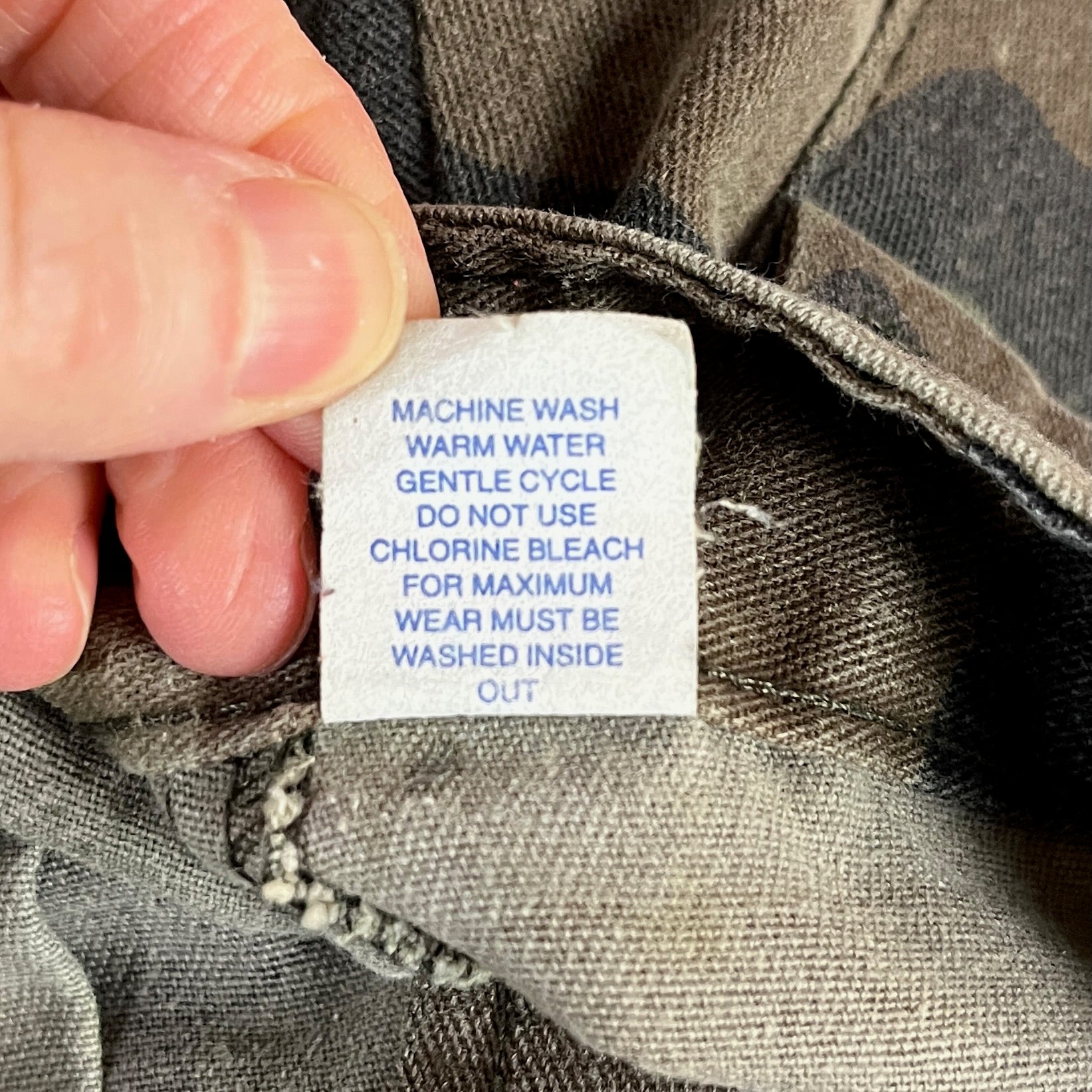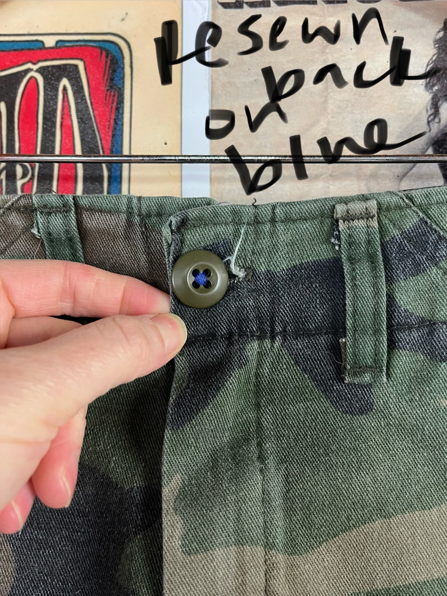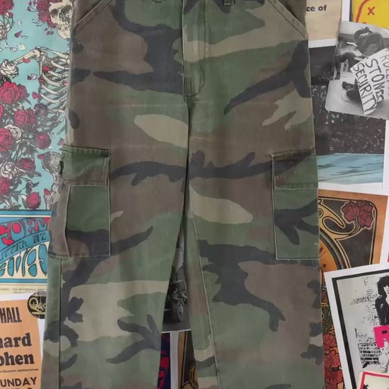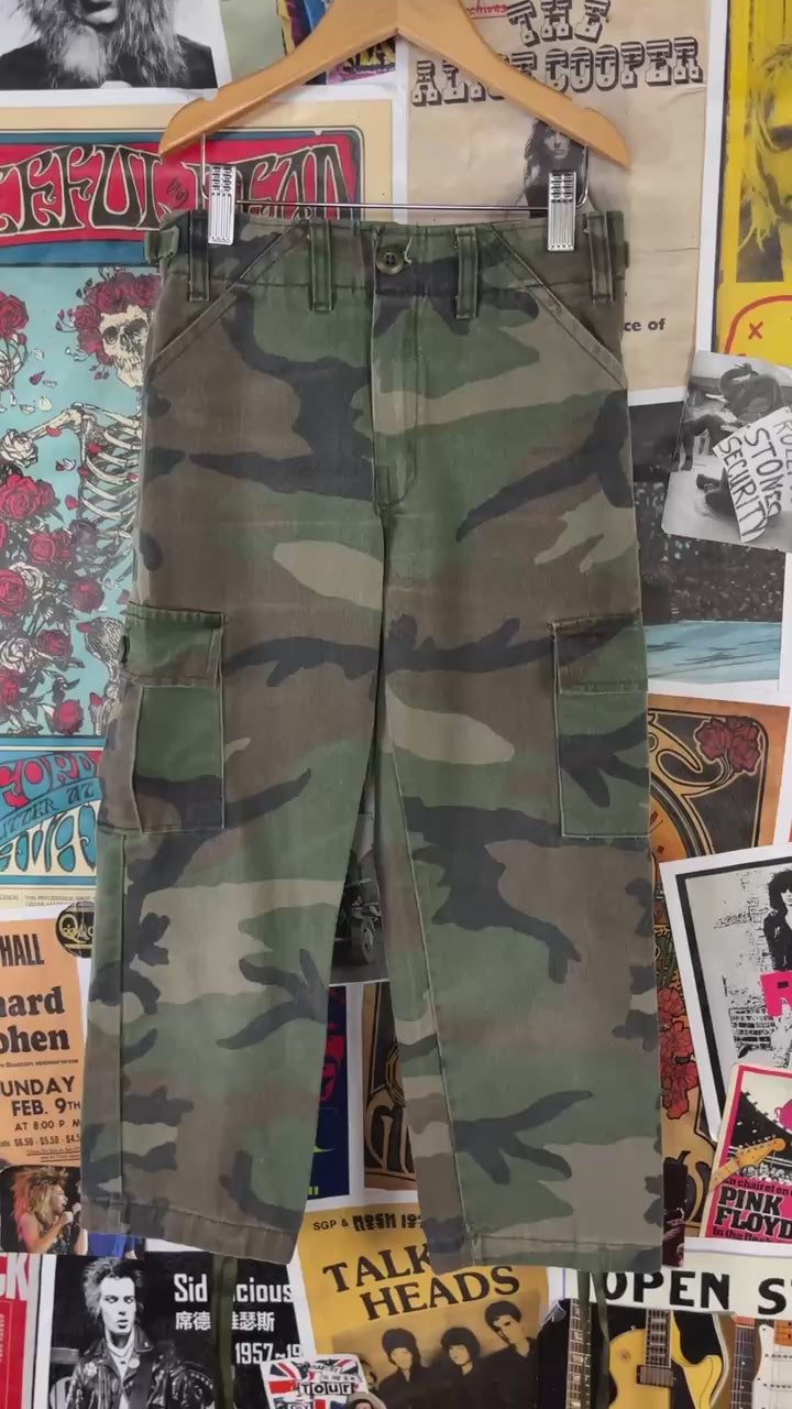 Vintage kids unisex green camouflage camo print straight leg utility military style cargo pants by U.S.A. Has some light staining at the upper back waist, but are in otherwise good preowned condition. Features a zip fly and buttons at the waist. Feels like a poly-cotton blend. Tagged kids size 8, which we estimate to fit age 7. Please check measurements.