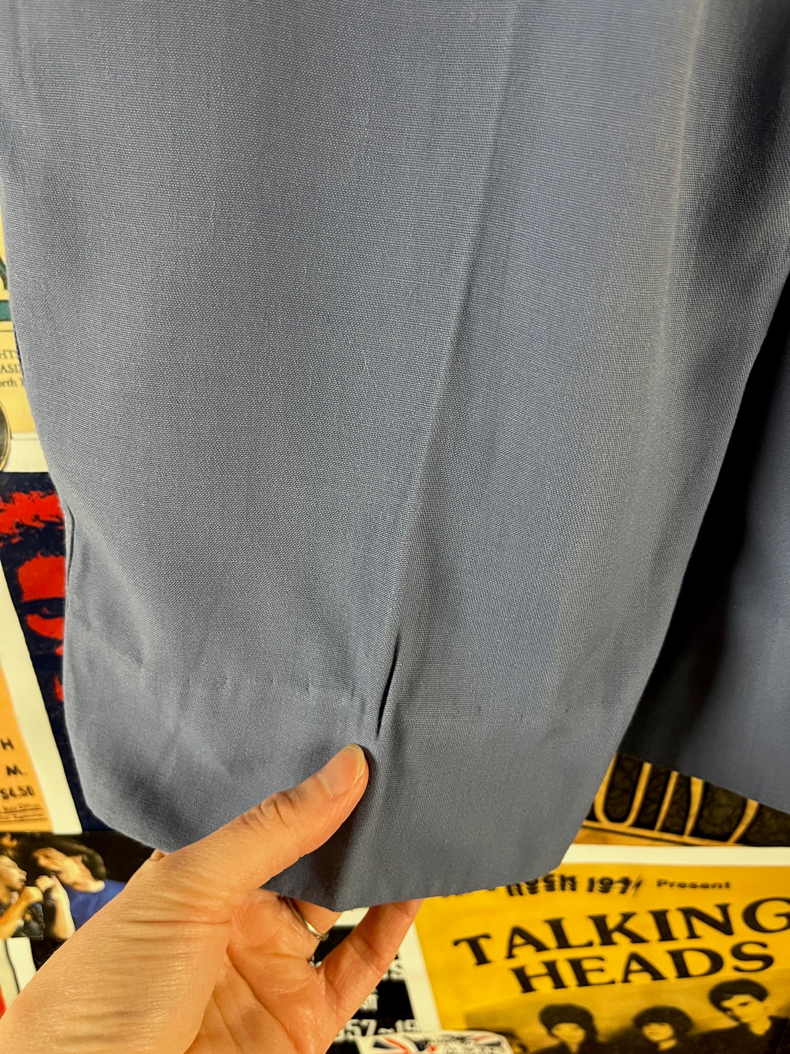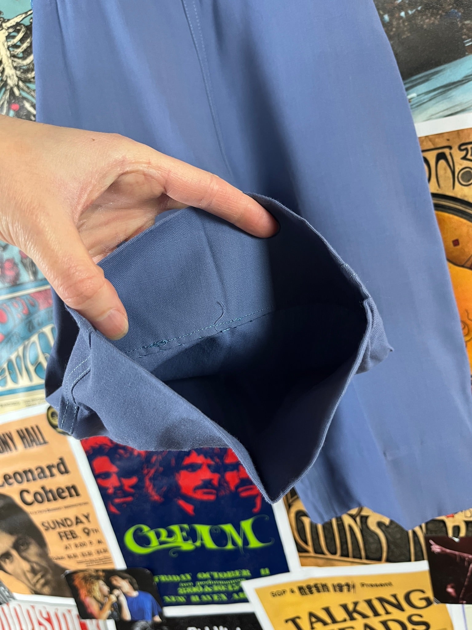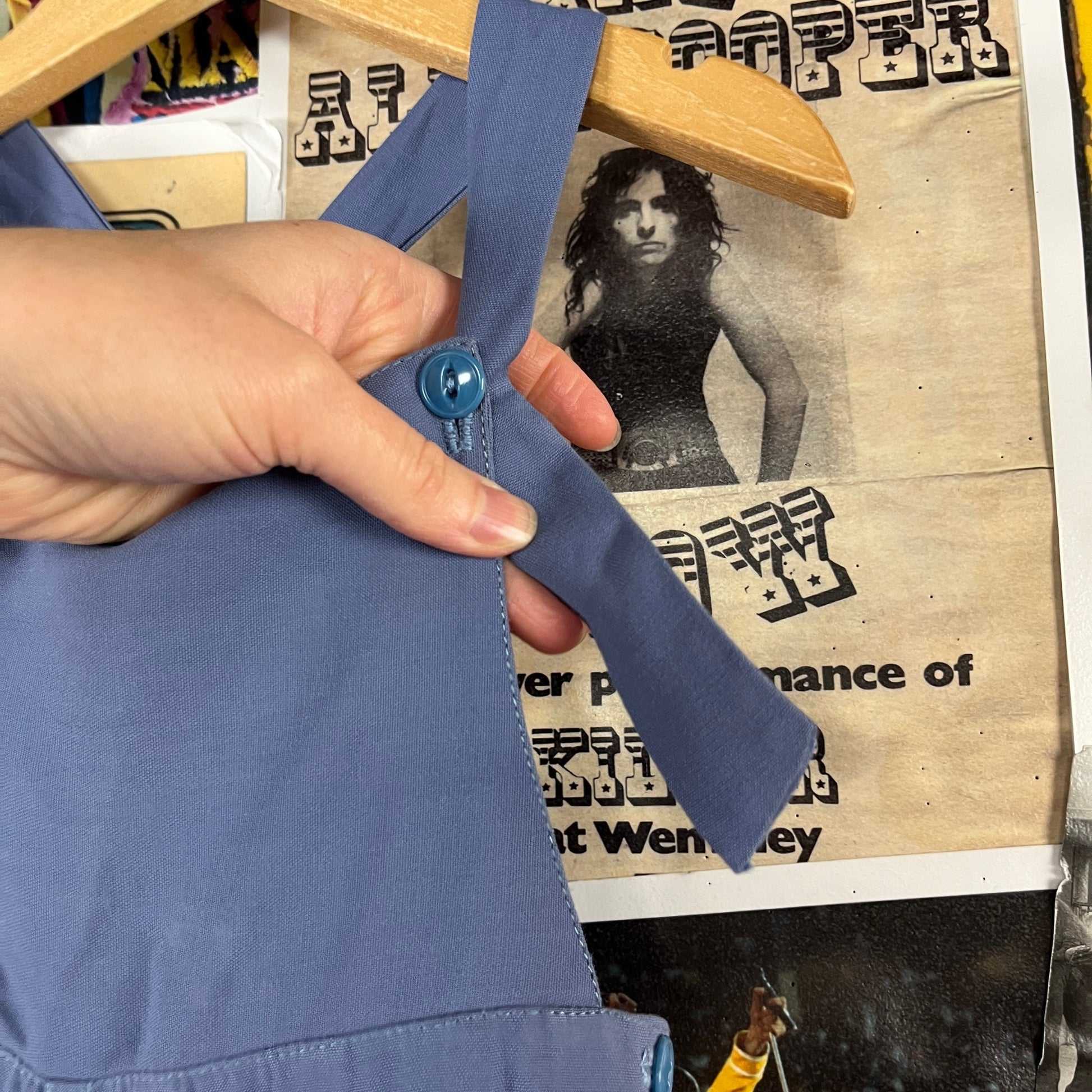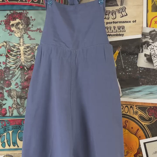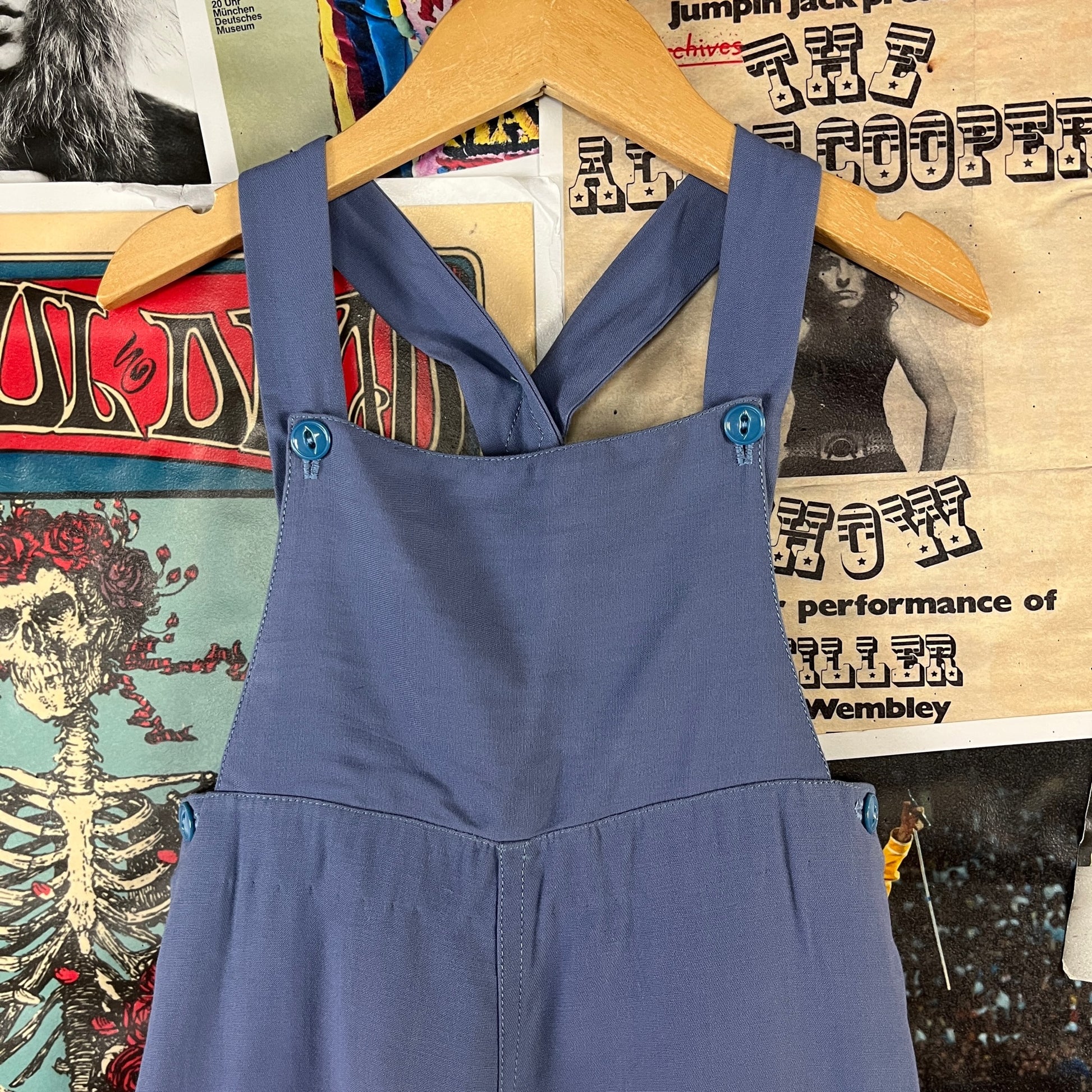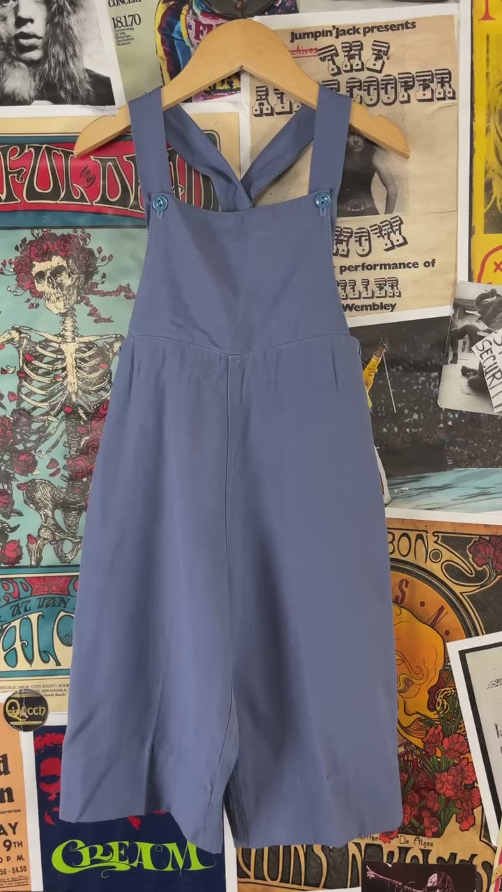 Adorable vintage boys or girls unisex retro 1950s-60s plain periwinkle blue sleeveless wide leg overall jumpsuit with cat eye buttons. Feels like a rayon blend, but am uncertain of the fabric makeup. There is no label or tag size, and they may be handmade. We estimate them to fit size 2T, but please check measurements as this is an estimate. You can see the interior stitching from the front and the stitch was pulled a little too tight on the leg cuff so there is a small wrinkle, but they're in otherwise good preowned condition.