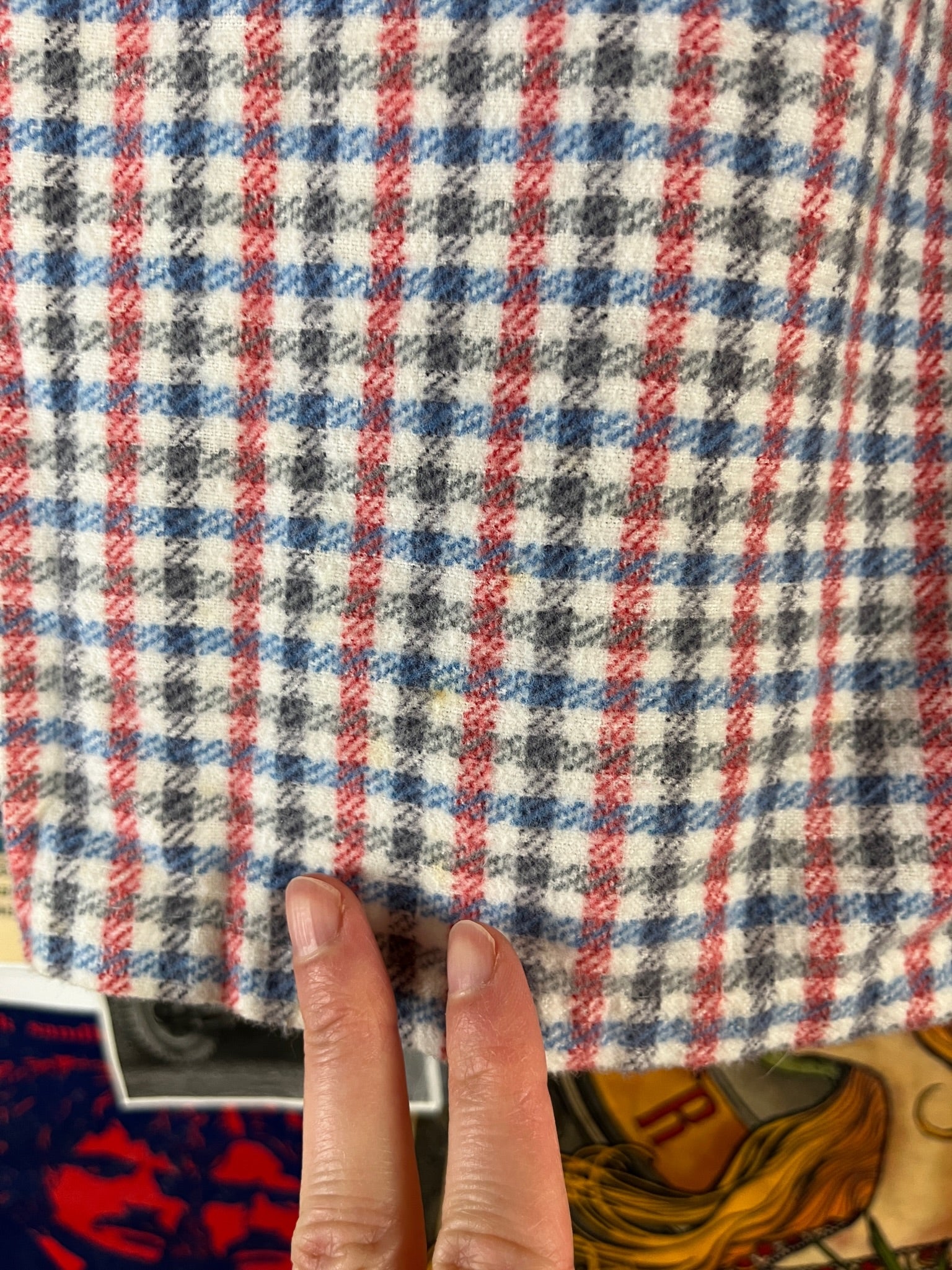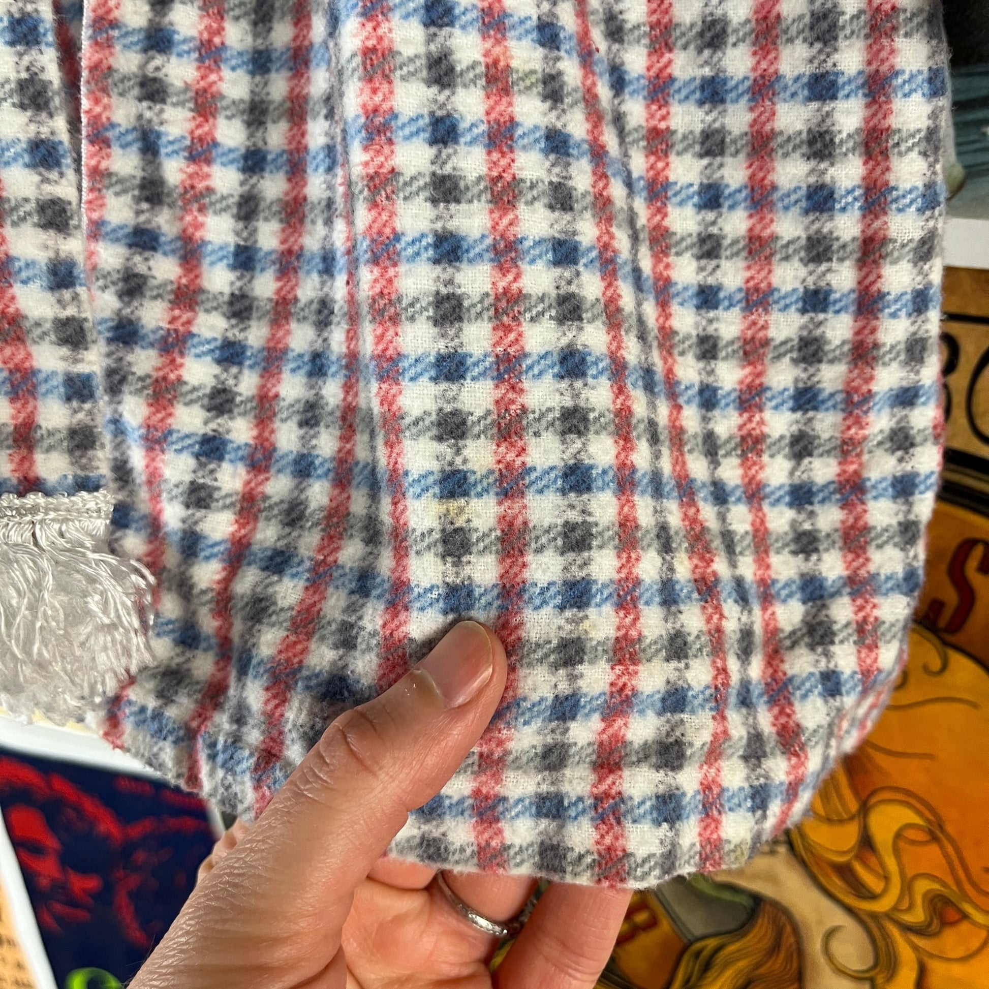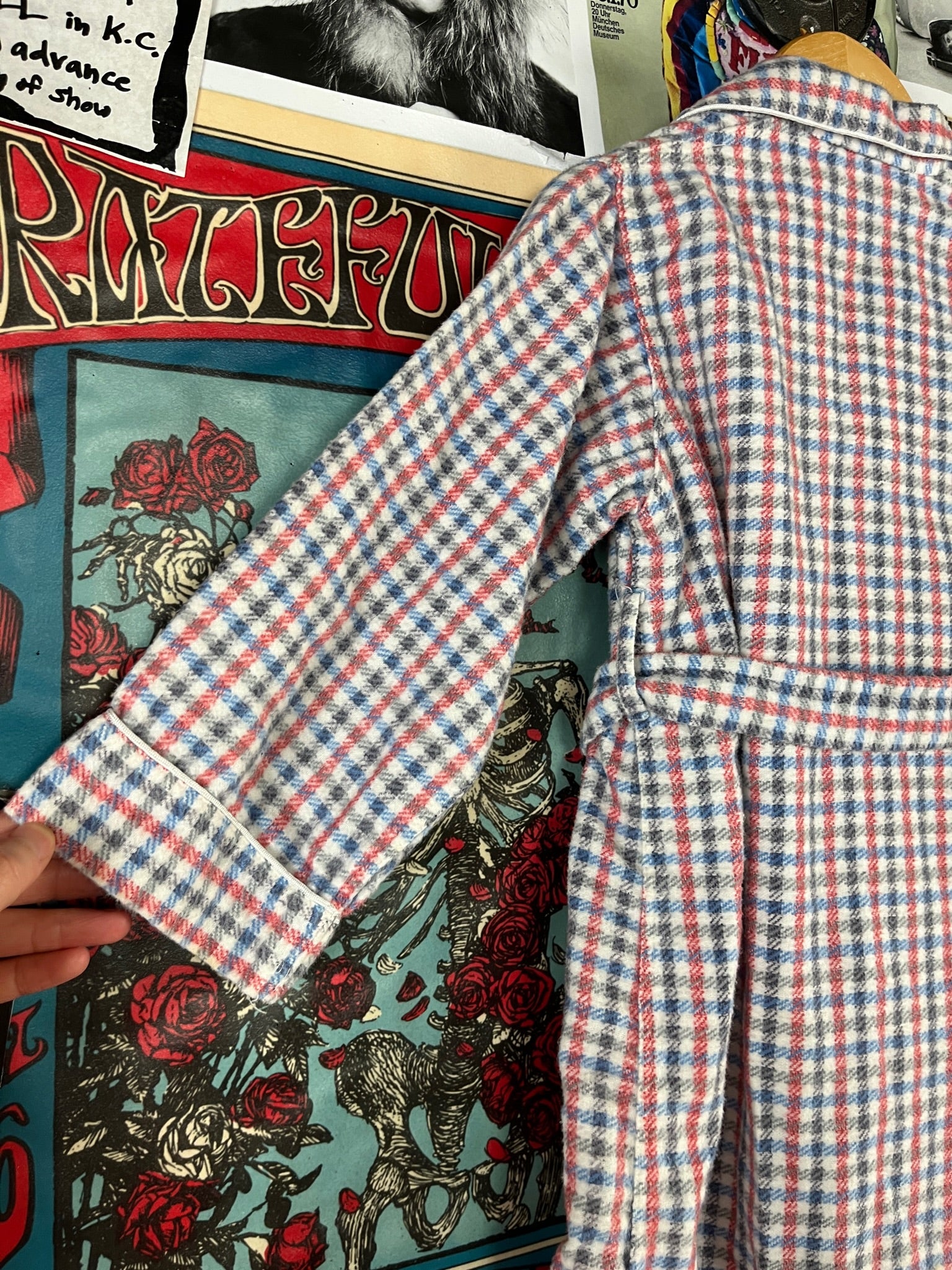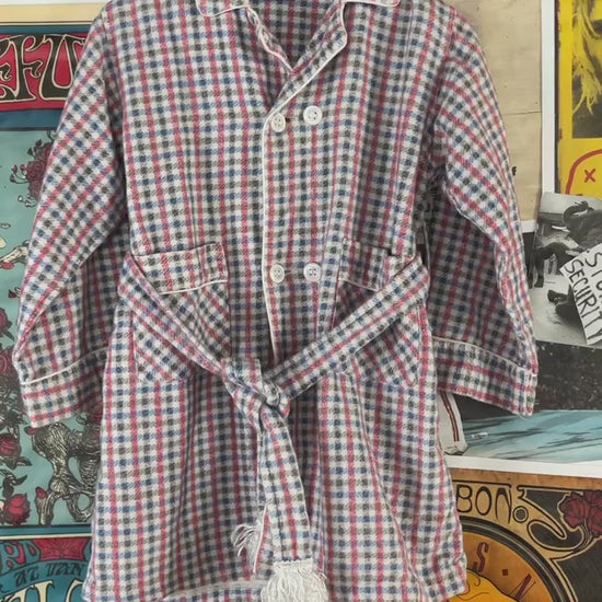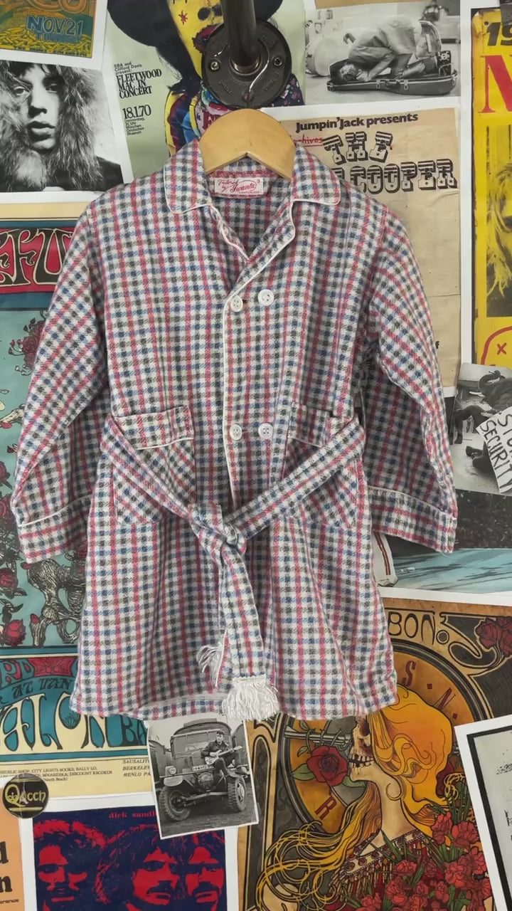 Adorable vintage boys kids retro 1950s white, blue, red, and black check plaid belted double breasted sanforized long sleeve collared bathrobe tailored by Juranta. Tagged size 3T. Features a fringe tassel pom belt and two hand pockets. Has a few light spots, but is in otherwise great, pre-owned condition.