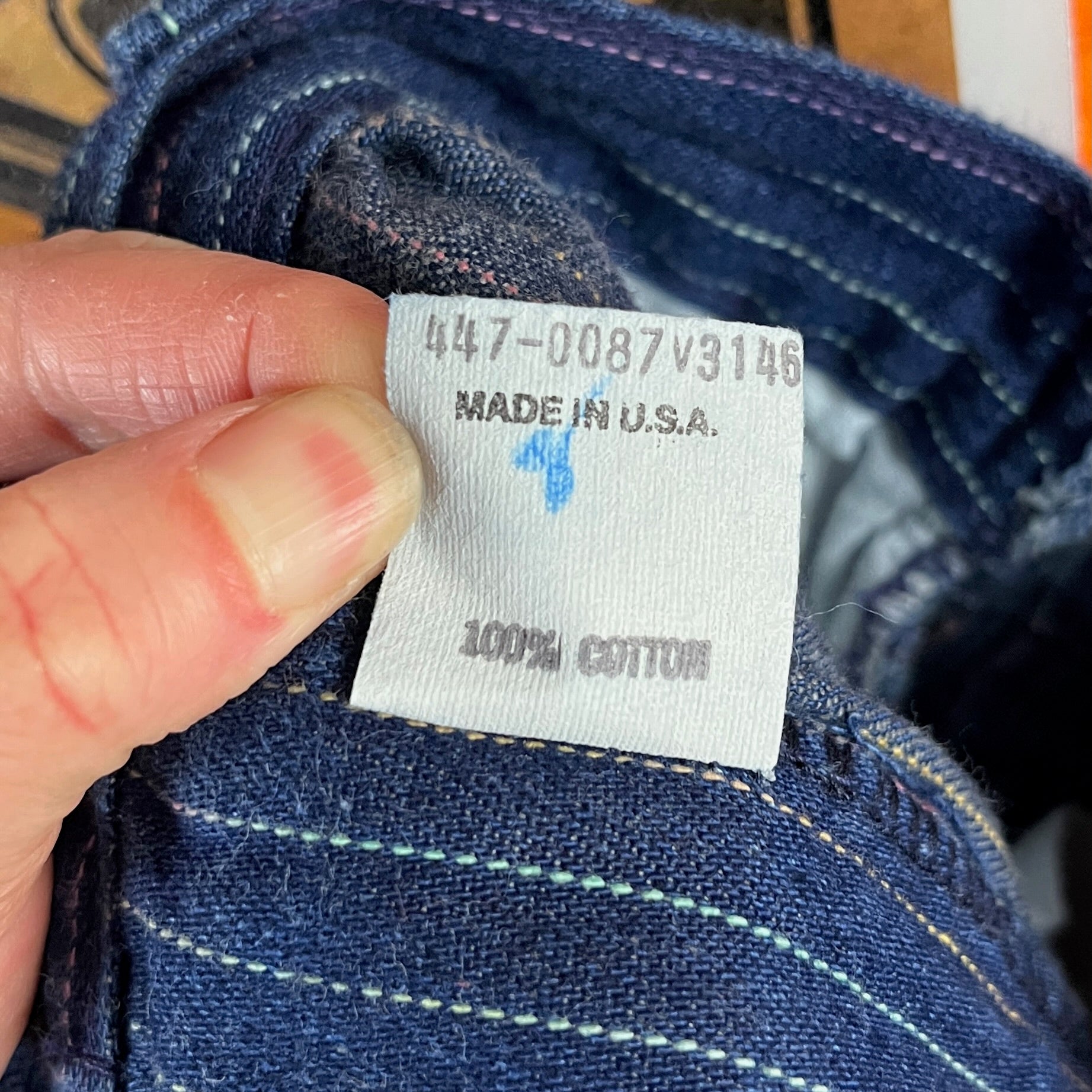 Fun vintage toddler girls kids 1980s dark wash denim rainbow pinstriped straight leg jeans by OshKosh B'Gosh. Features an elastic waistband, hand pockets, a zip fly and snap buttons at the waist. Made in the USA of 100% cotton. Tagged size 5 regular, but we estimate it to best fit girls size 4T. Please check measurements for sizing.