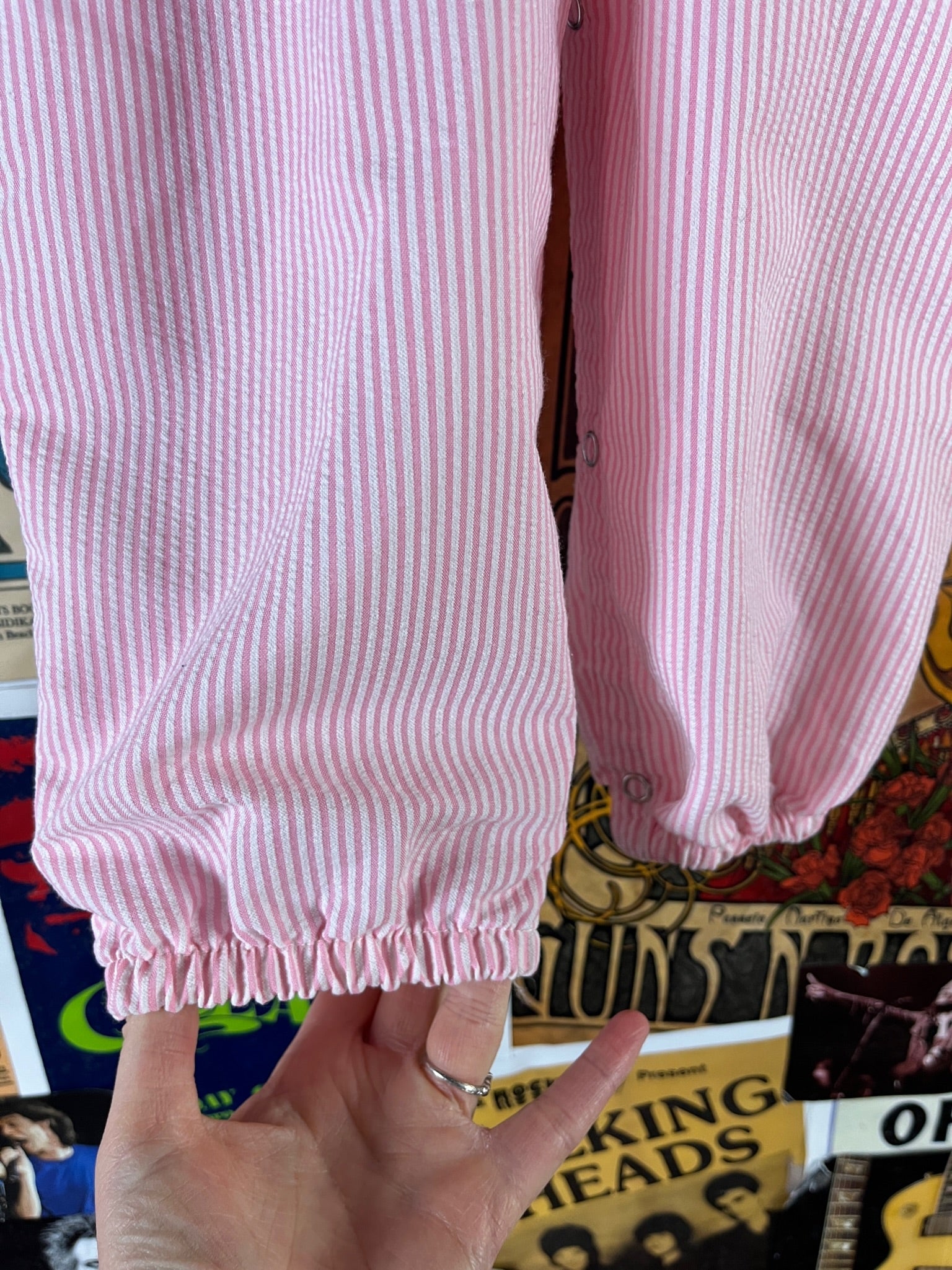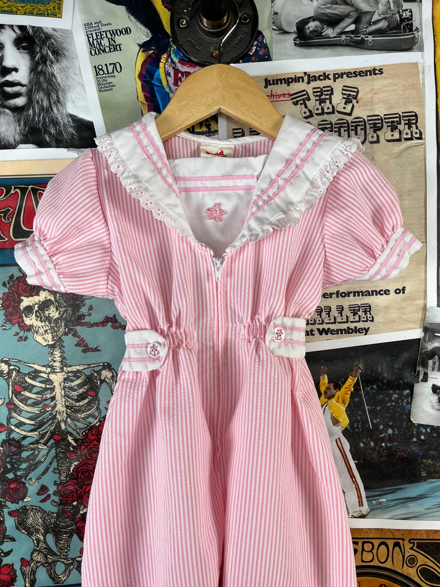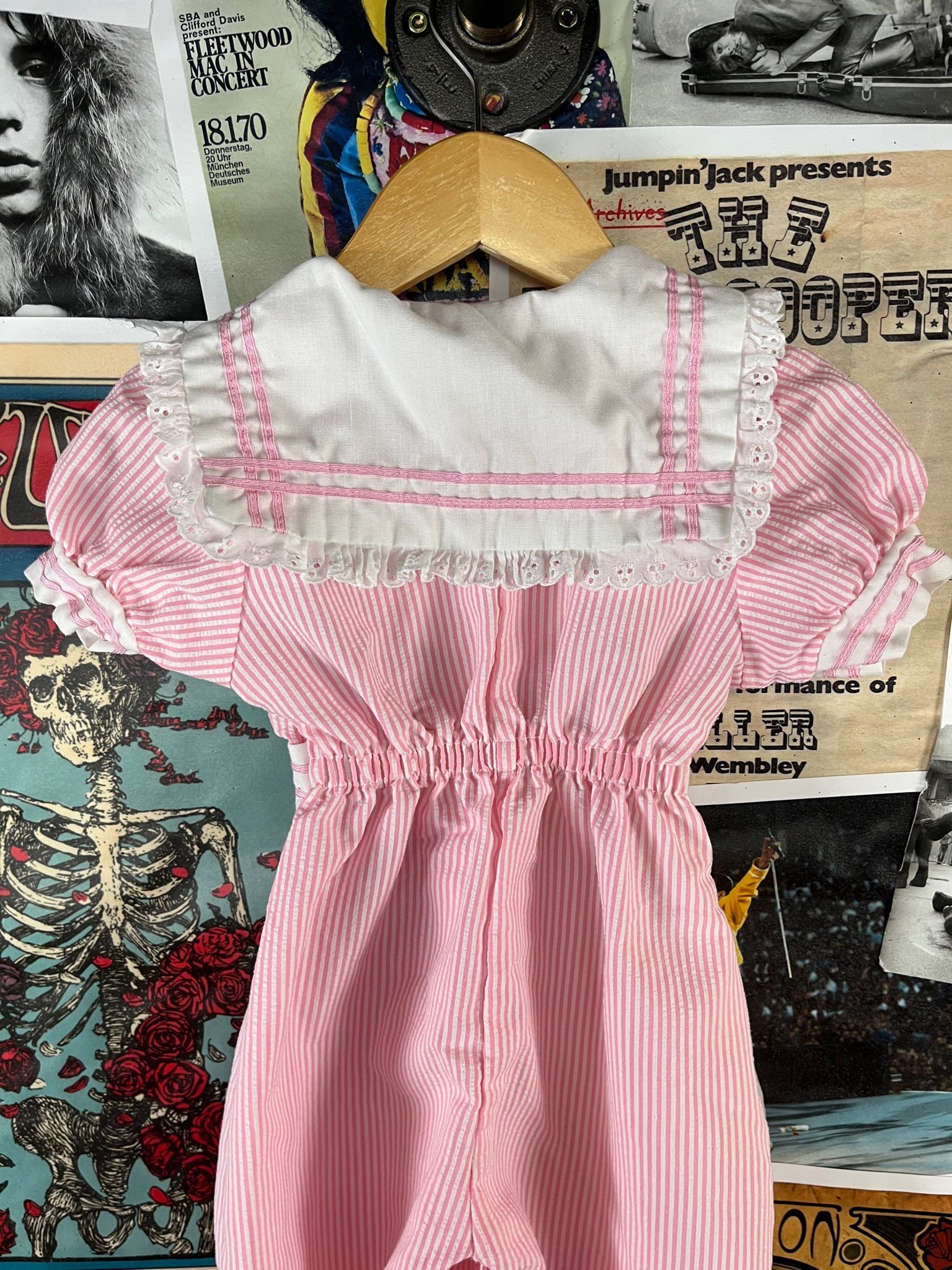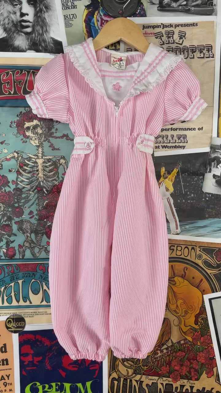 Vintage Toddler Girls 70s-80s Pink White Seersucker Sailor Collar Jumpsuit 18 Months