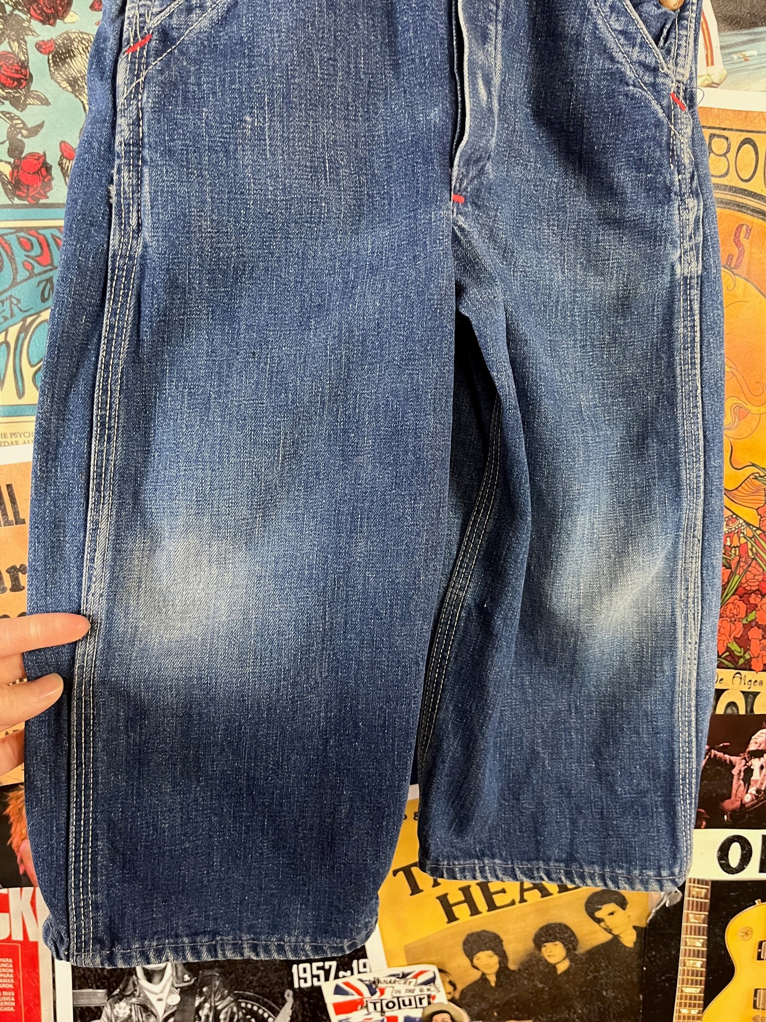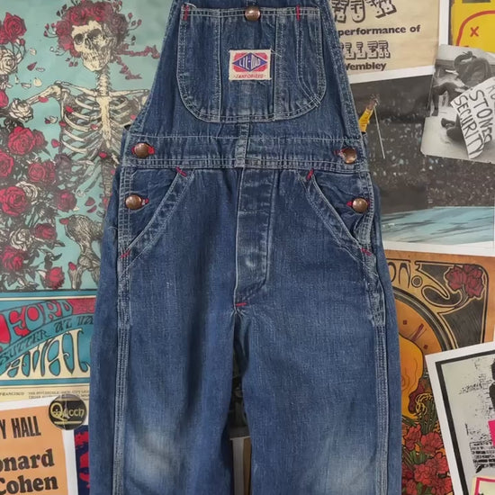 Vintage toddler kids retro 1960s-70s blue dark wash jean Lil San sanforized denim suspender dungaree overalls. There is no tag size. We estimate them to fit boys size 3T, but please check measurements. There is minor fraying at a button hole, light dirt wear discoloration, fading at the knees, a little discoloration at the top of the fly, pock seams having missing threads and interior staining.