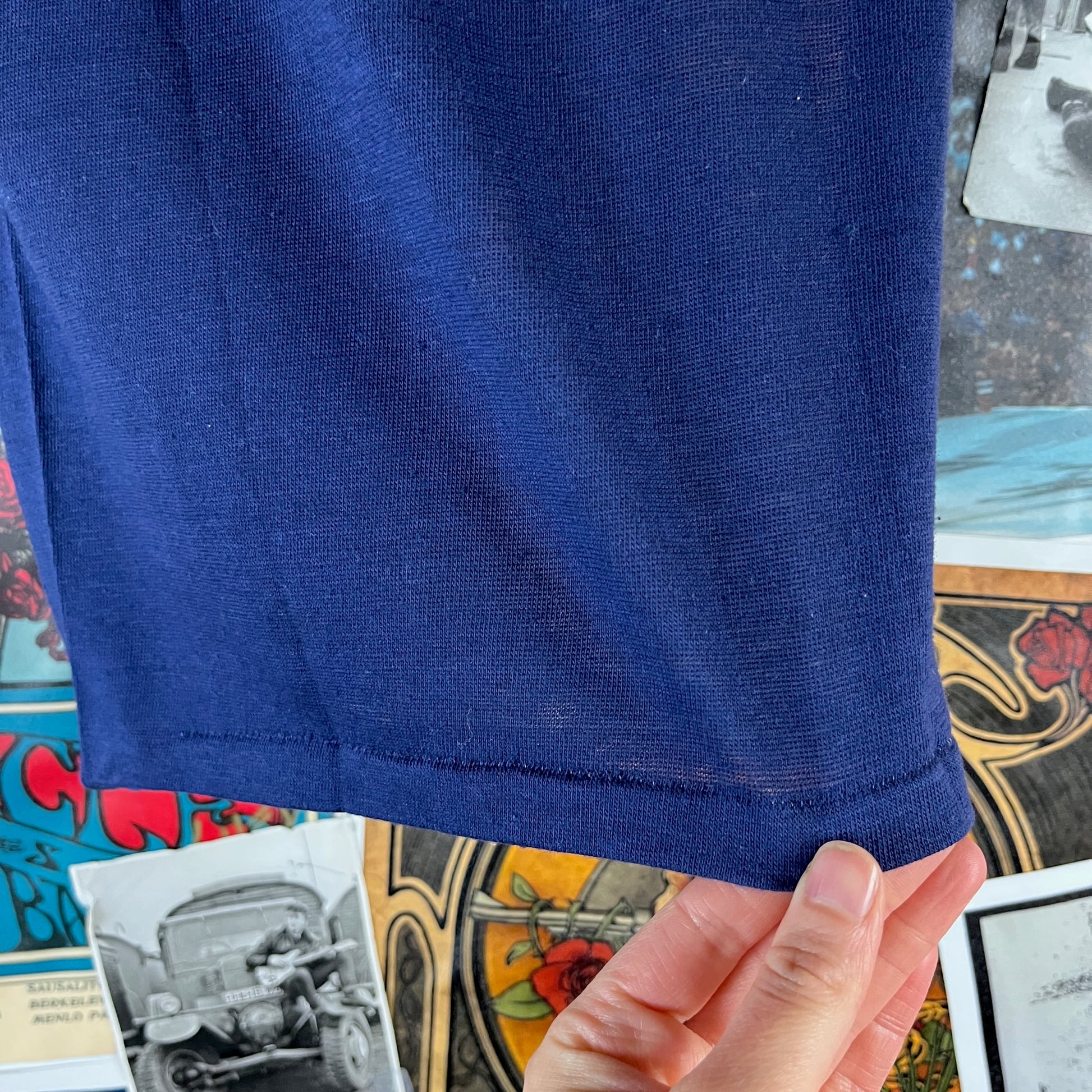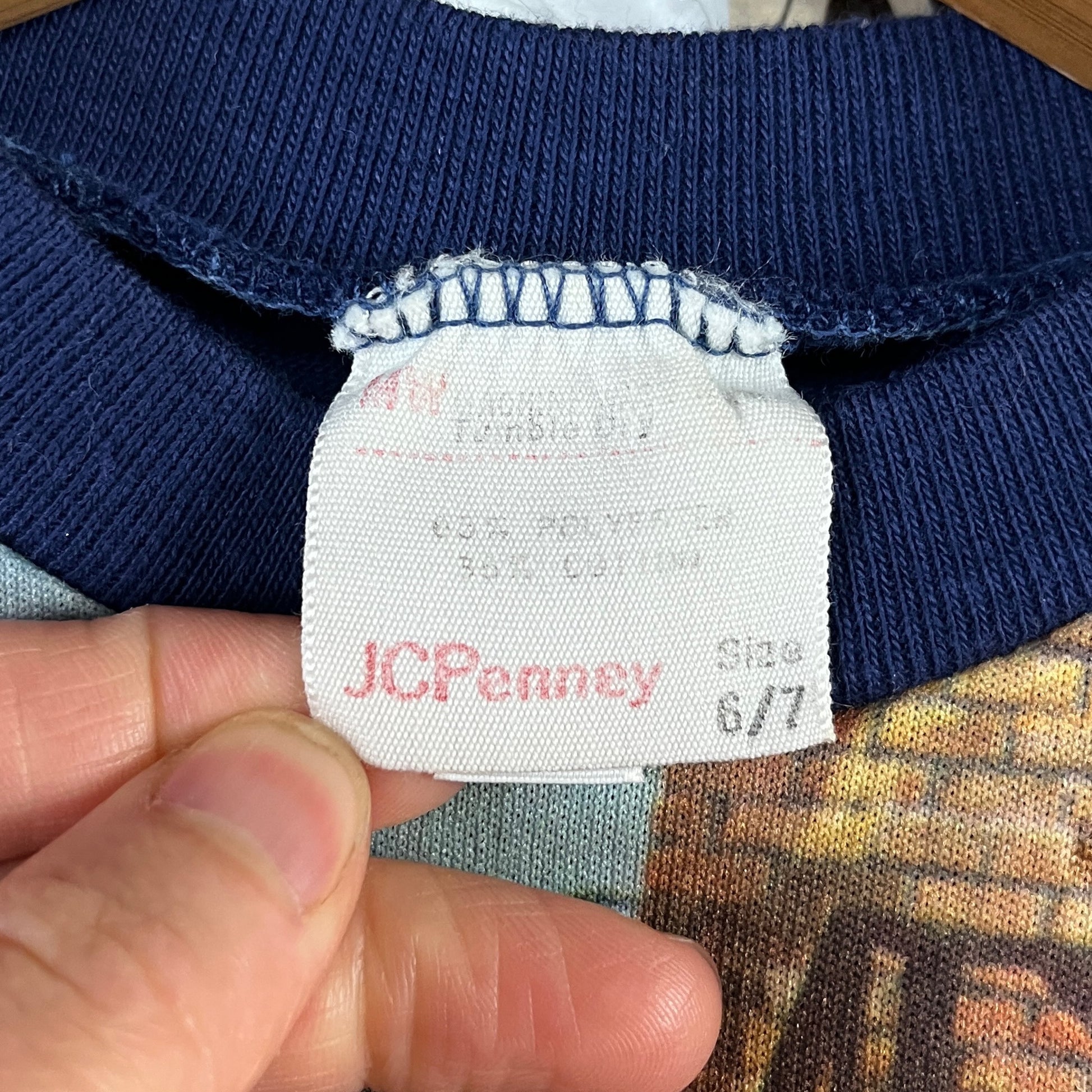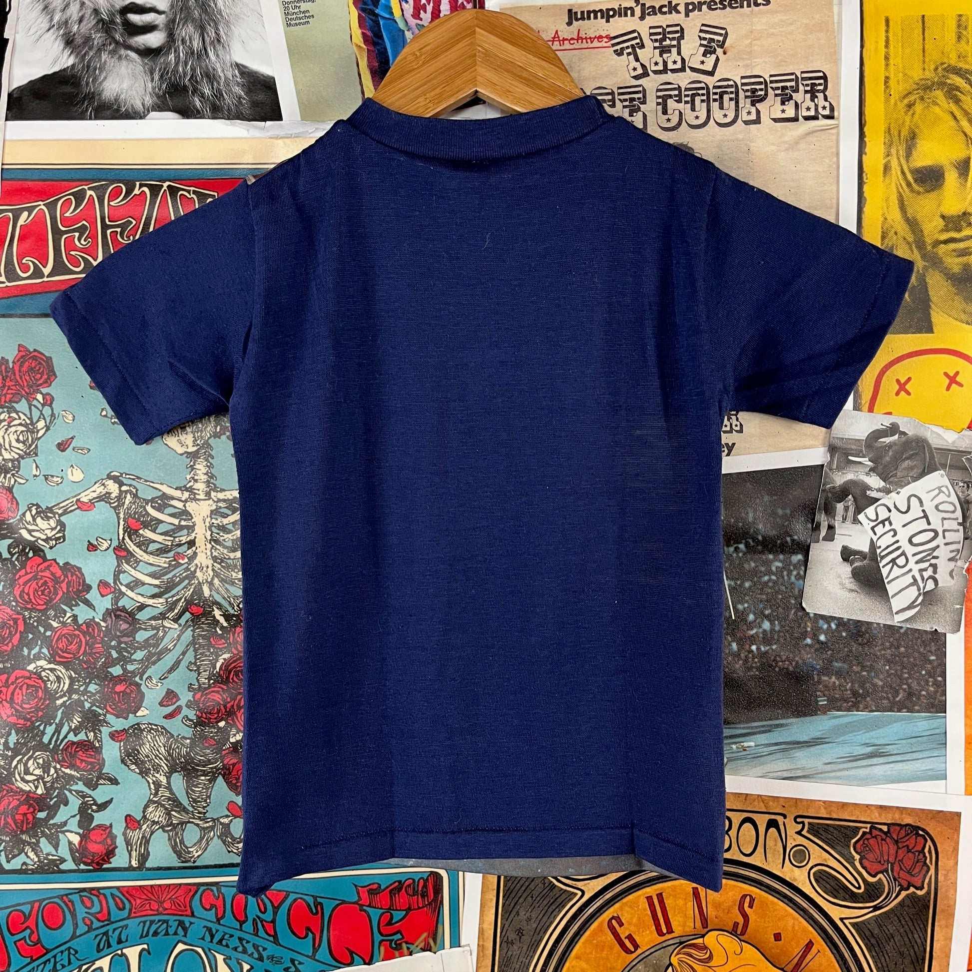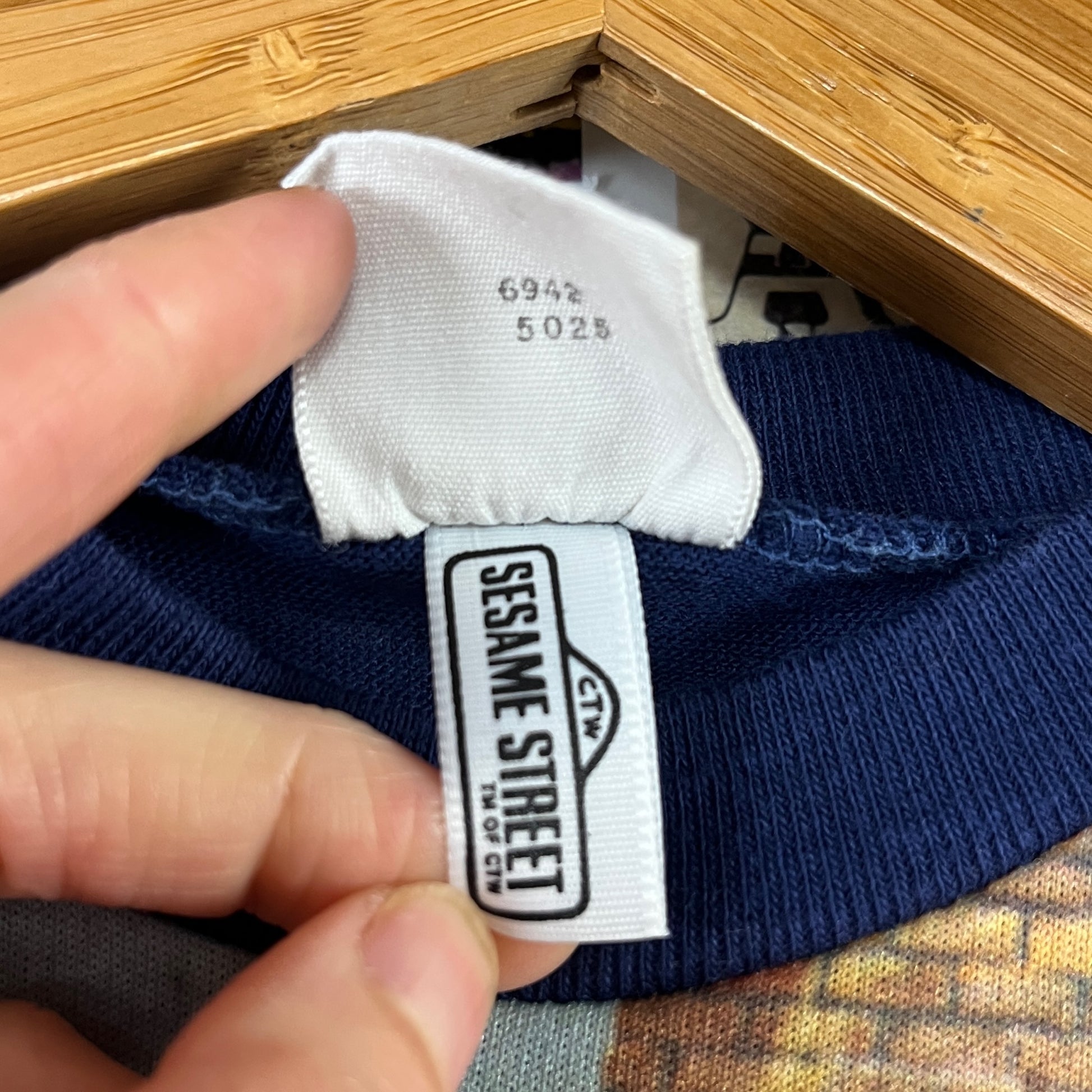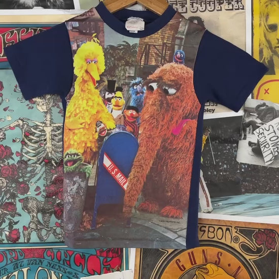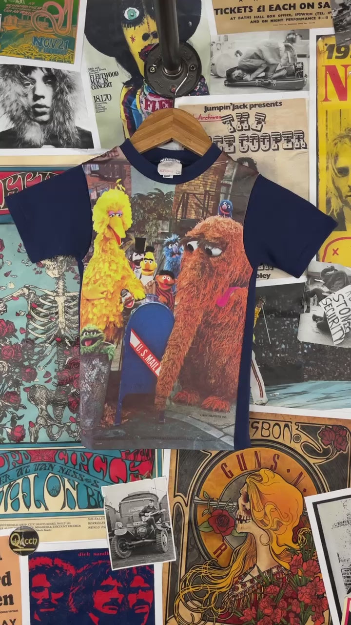 Super cool toddler kids vintage 70s-80s blue multi-color short sleeve single stitch Sesame Street muppet characters Snuffleupagus, Big Bird, Oscar the Grouch, Bert and Ernie, Grover, Herry Monster cartoon graphic crewneck ringer t-shirt by JCPenney. Tagged kids size 6/7, but we estimate it to fit kids size 3T-4T. Please check measurements as this is an estimate. American television pop culture!