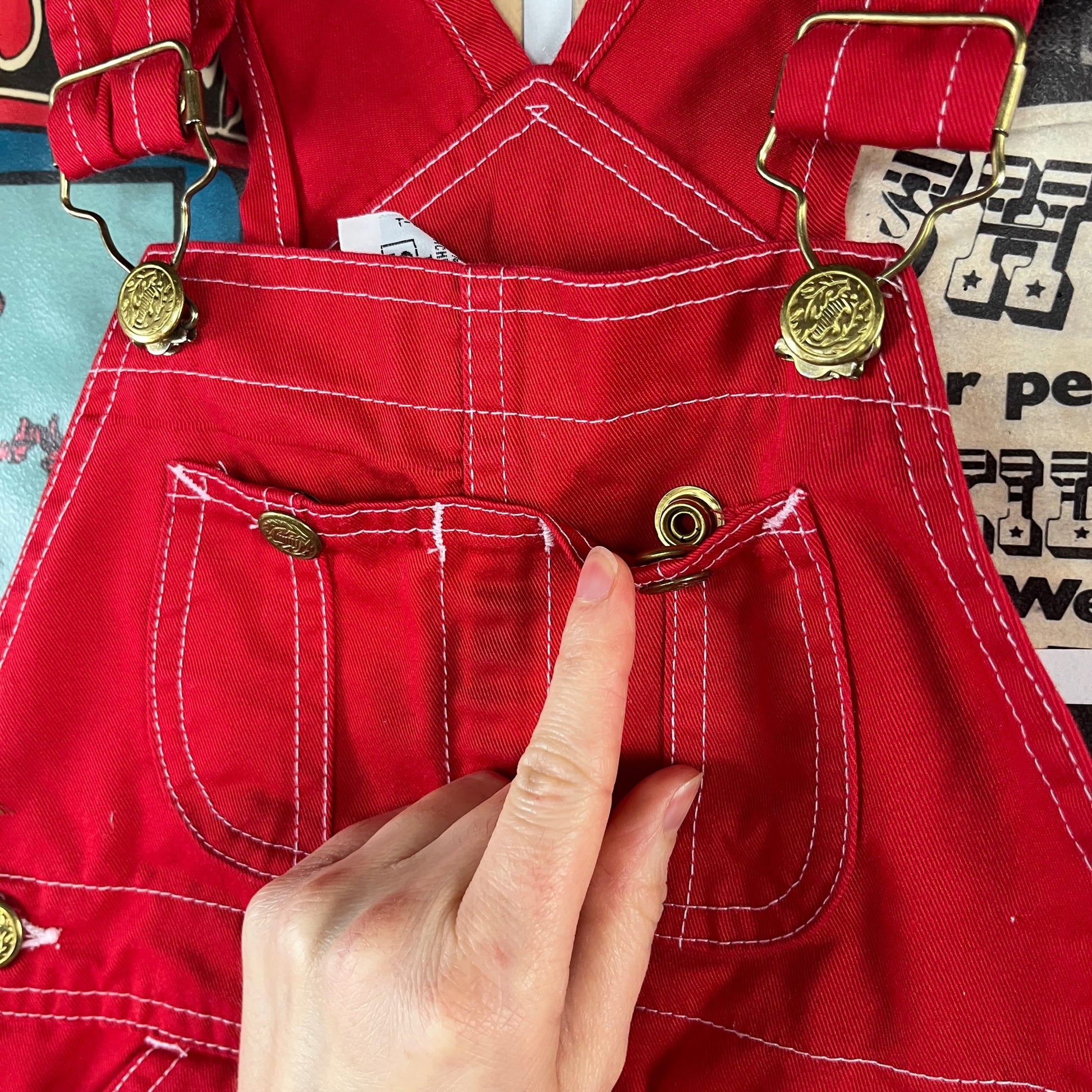 Vintage toddler kids retro 1970s-80s solid plain red sleeveless Sears bib dungaree overalls. Made in Hong Kong of 55% cotton and 45% polyester. Tagged size 4, but we estimate it to best fit size 3T. Please check measurements. Are in good preowned condition. Such a versatile piece for your little ones wardrobe!
